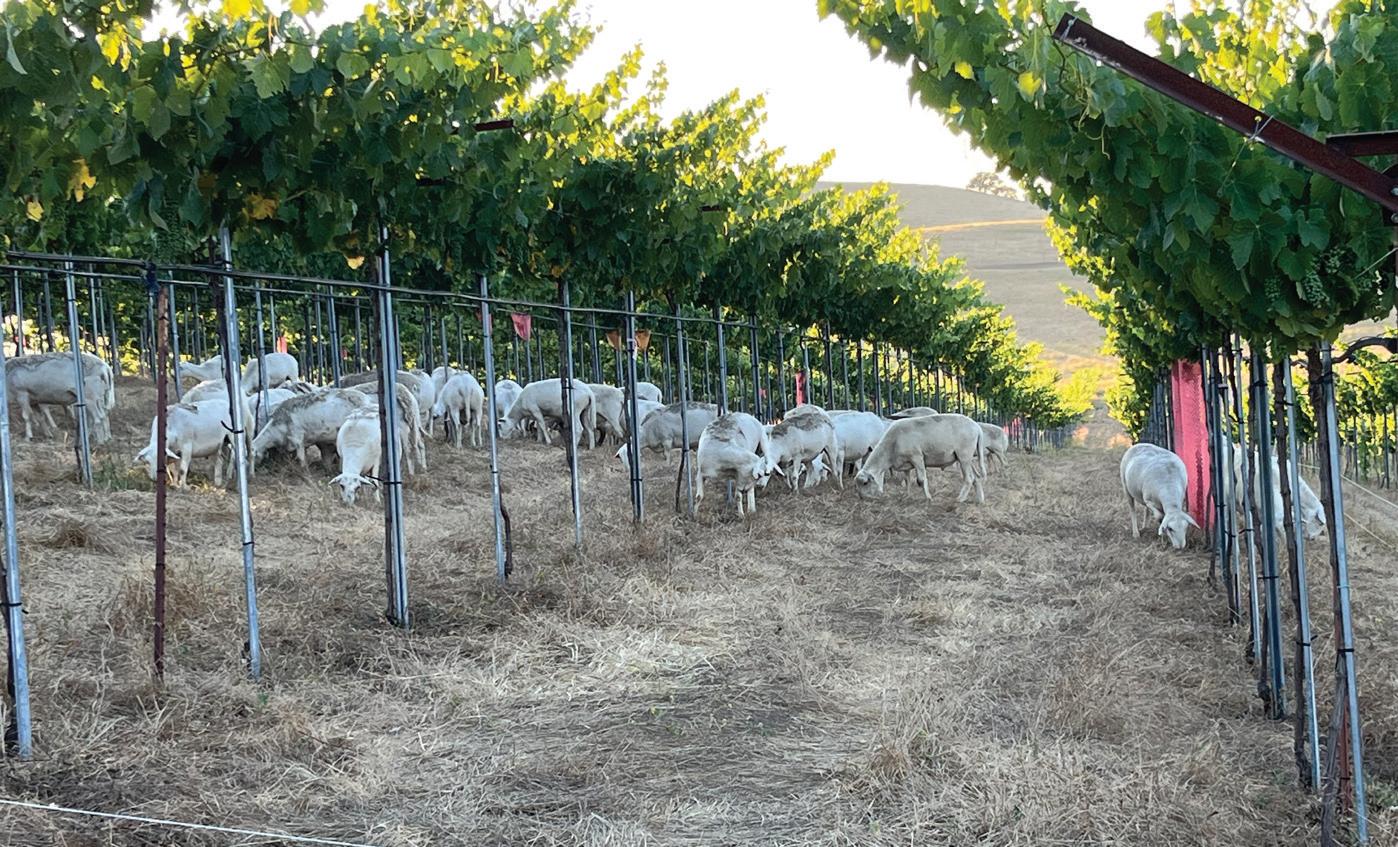 life are also on the rise. No cover crops have been planted in the last three years, but native plant species are colonising the vineyard. A study found that beneficial predator and parasitoid insects are two to three times more abundant than in a neighbouring conventional vineyard, while pest insect levels are the same as the conventional vineyard without any use of pesticides. All of these benefits have flowed from the initial action of raising the trellises to allow year-round sheep grazing and a permanent sward.