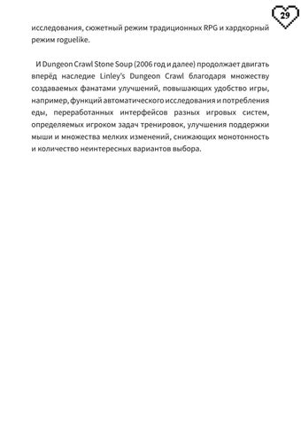 29 исследования, сюжетный режим традиционных RPG и хардкорный режим roguelike. И Dungeon Crawl Stone Soup (2006 год и далее) продолжает двигать вперёд наследие Linley’s Dungeon Crawl благодаря множеству создаваемых фанатами улучшений, повышающих удобство игры, например, функций автоматического исследования и потребления еды, переработанных интерфейсов разных игровых систем, определяемых игроком задач тренировок, улучшения поддержки мыши и множества мелких изменений, снижающих монотонность и количество неинтересных вариантов выбора.