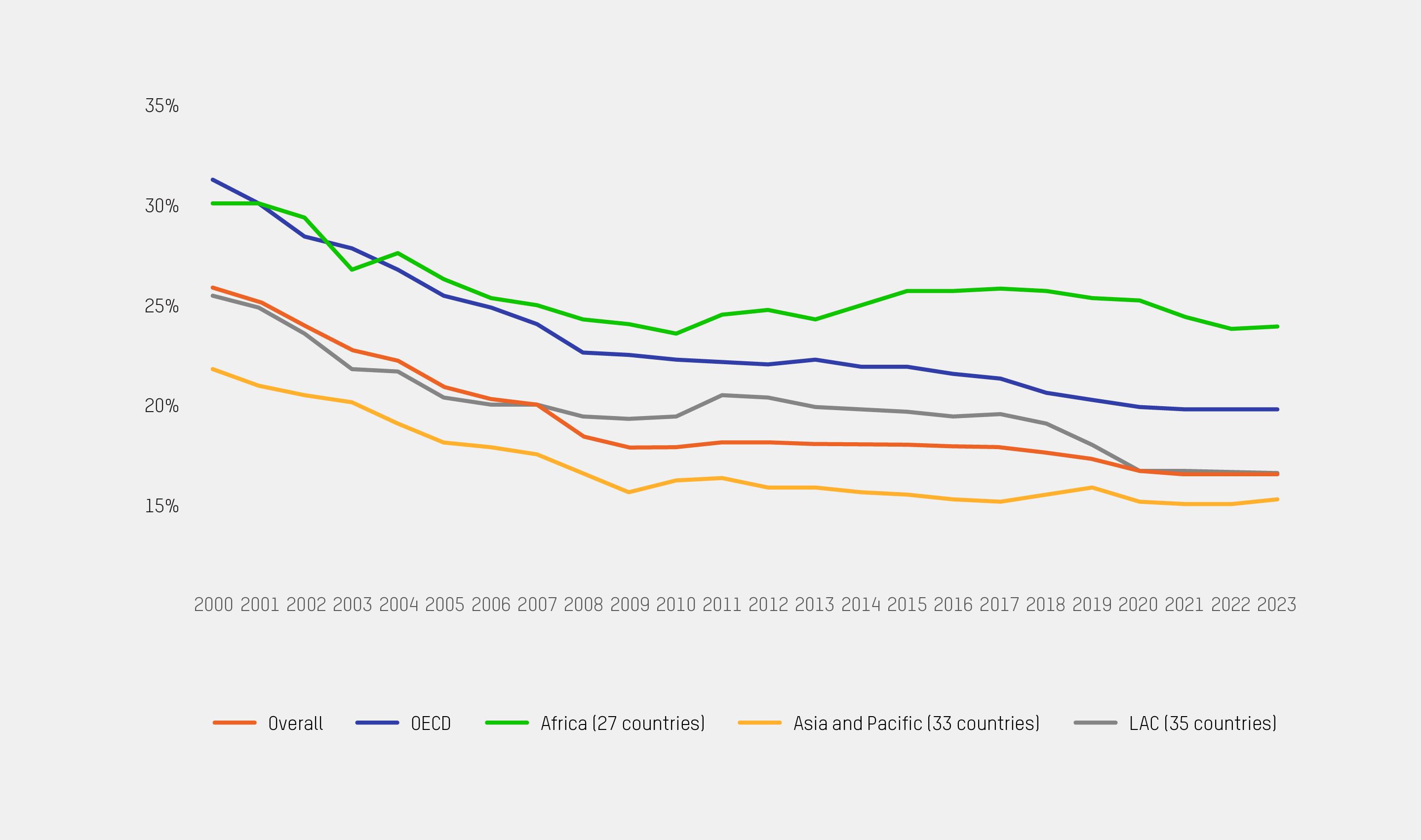 FIGURE 4: CORPORATE TAX RATES HAVE FALLEN AROUND THE WORLD Average statutory corporate income tax rates by region 2000–2023