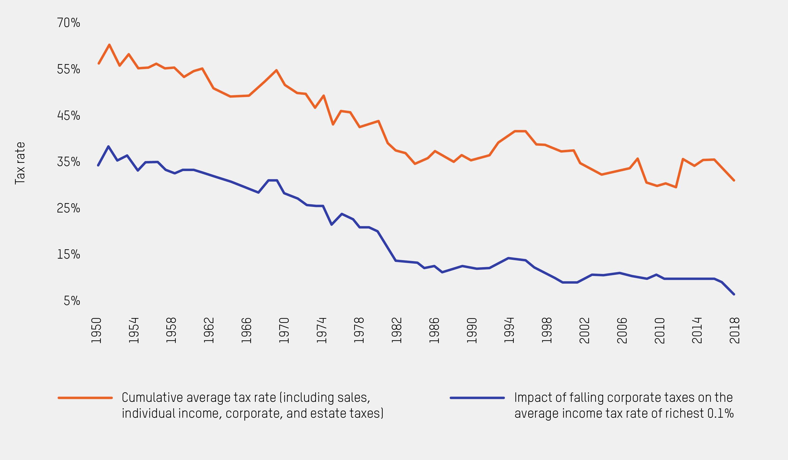 As corporate taxation has collapsed and corporate profits have soared, those at the top have done fabulously. In high-income countries, falling rates of tax on corporations have coincided with a period in which a rising share of income is going to the top 1%.326 Evidence shows that corporate taxes are progressive and they are borne disproportionately by the richest people.327 This means the collapse in corporate tax in recent decades has essentially provided another huge tax cut for the richest people in the world. The economists Emmanuel Saez and Gabriel Zucman have shown, for example, that the massive fall in tax rates by the richest individuals in the USA is significantly driven by cuts to corporate taxes (Figure 5).328
