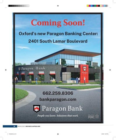 68 PROFILE 2023 | GREATNESS HAPPENS HERE Coming Soon! Oxford's new Paragon Banking Center: 2401 South Lamar Boulevard 662.259.8306 bankparagon.com People you know. Solutions that work. Profile2023.indd 68 2/23/23 5:36 PM