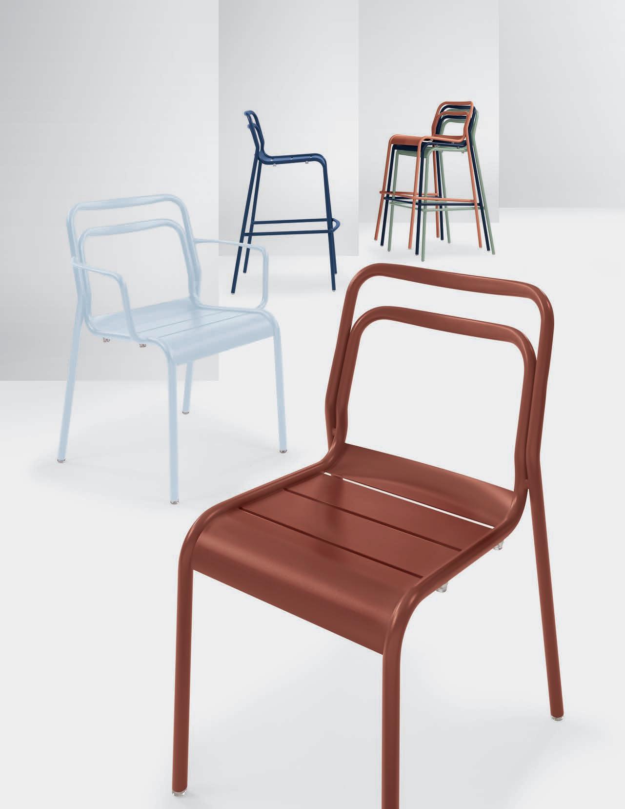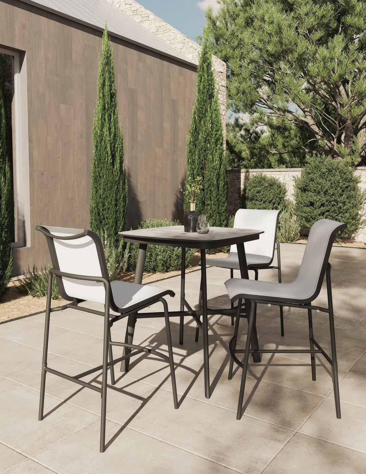 Eiland Club Chair, Coffee Table, All Aluminum Bar Stool, Armless Chaise Lounge, 36” Square Bar Table, Bar Stool, 63” Rectangular Dining Table, Armchair, 45” Square Dining Table, End Table & Loveseat For colors, materials, finishes & fabrics see pages 232-239