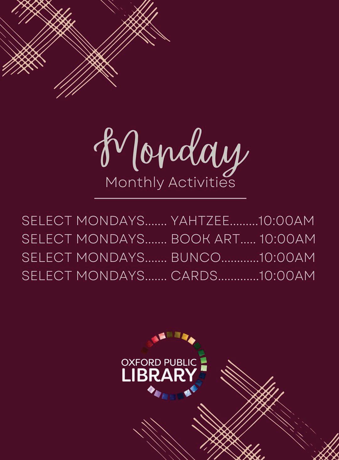 Adults will also have activities in the new year. Every Monday at 10:00 will feature a social activity for adults to attend and connect with others in our community. Check OPL’s calendar at www. oxfordpl.org/calendar for dates for each event: Card Sharks, Book Art, Bunco, and Yahtzee.