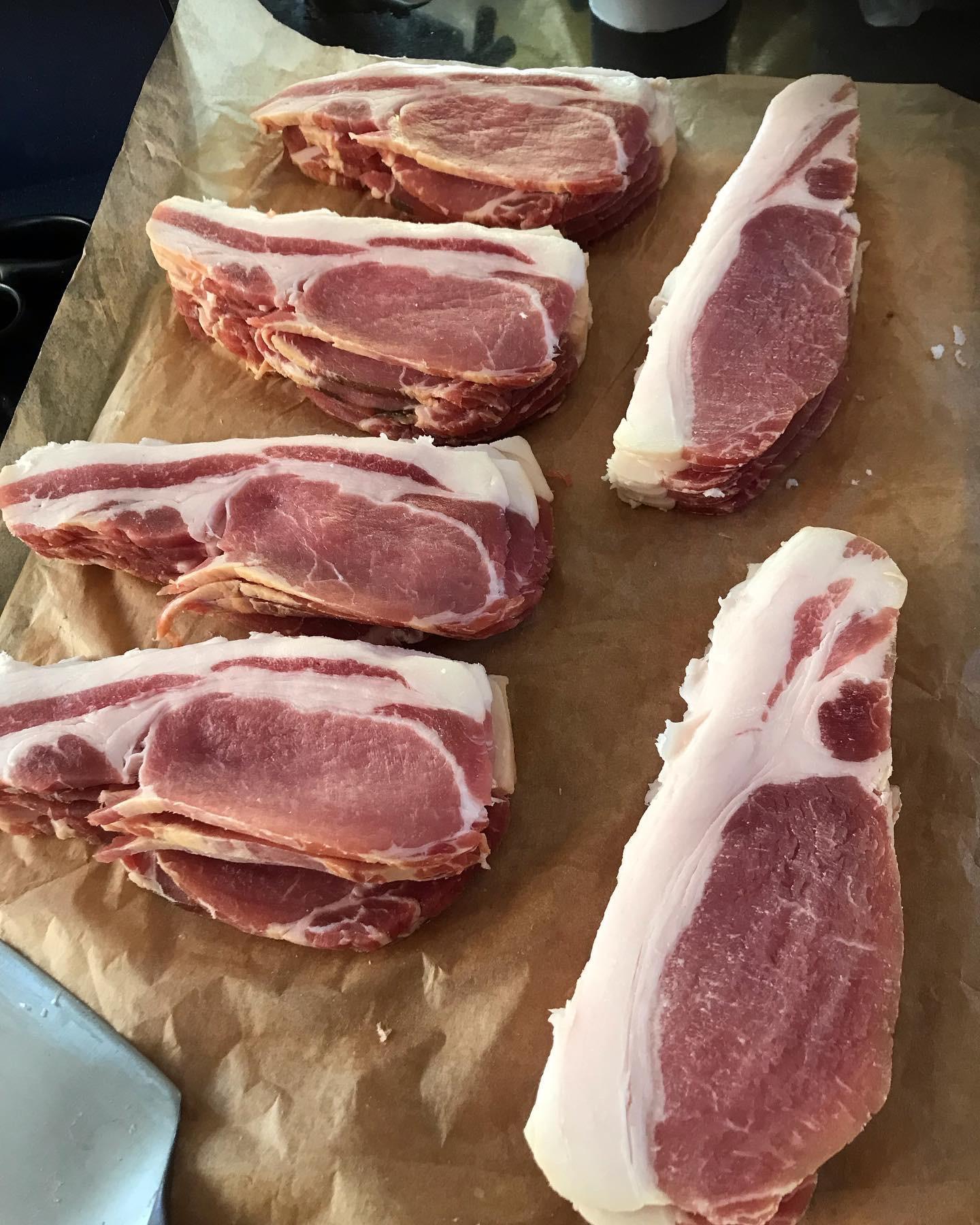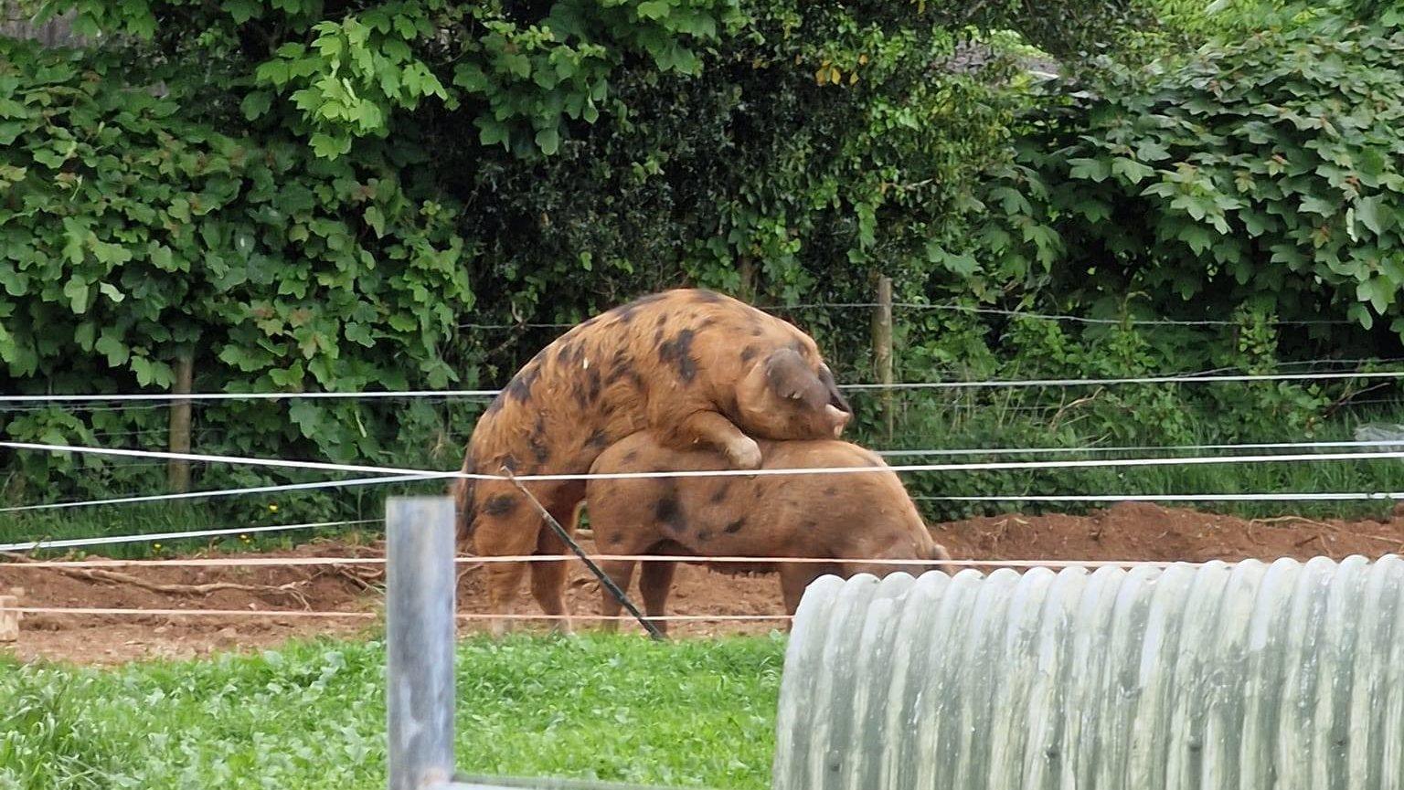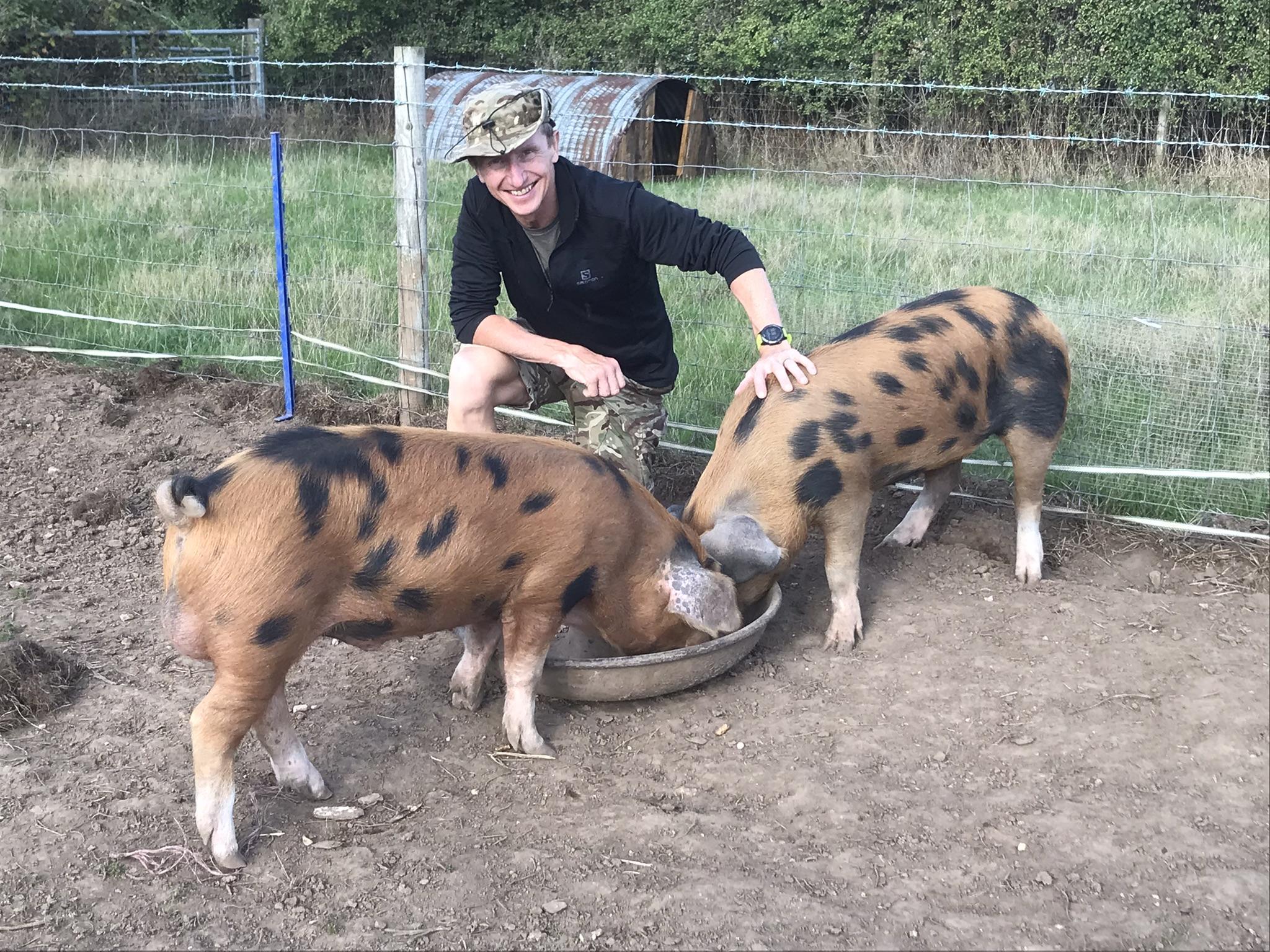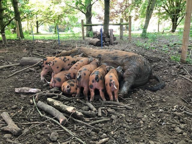 In 2022 our search began looking for a boar to hire, Kim soon popped me in touch with a contact from Suffolk, they kindly dropped off Ed who did the deed and inApril we were blessed with 12 gorgeous piglets from the two gilts. The piglets were reared outdoors fed on copious amounts apples and vegetables. The proud moment came in October when the first home bred, outdoor reared pork was featured at our local farmers markets and via farm collection.