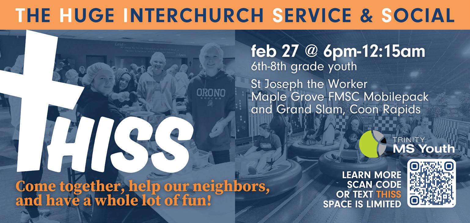 THISS is a joint event that brings ms youth and hs youth leaders from Trinity, Lord of Life Maple Grove, and Christ Lutheran Blaine youth together for a mid-winter night. Join us as we gather to pack meals for Feed my Starving Children, then head to Grand Slam for some fun. Food will be available at Grand Slam.