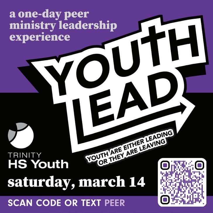Youth who want to grow in their faith and develop leadership skills are invited to a fun, engaging day at Trinity called Youth Lead. This powerful one-day peer ministry event is designed to inspire and equip both youth & adults for leadership within their congregations. To register, text PEER to Trinity.