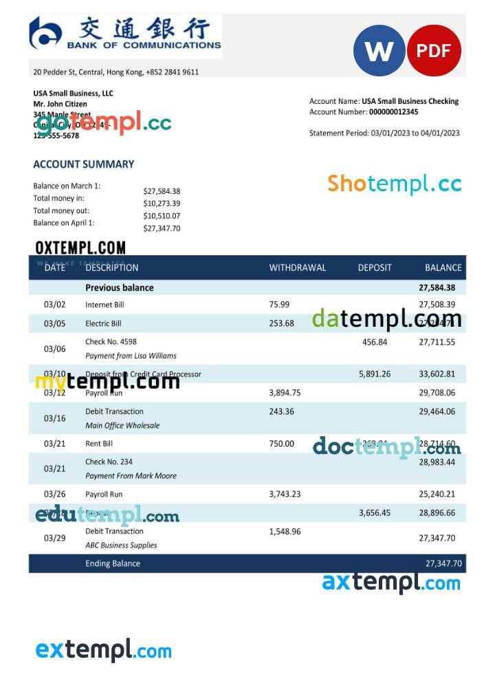 Completely editable bank enterprise account statement template – to fill out your detailed information and business finances easily.