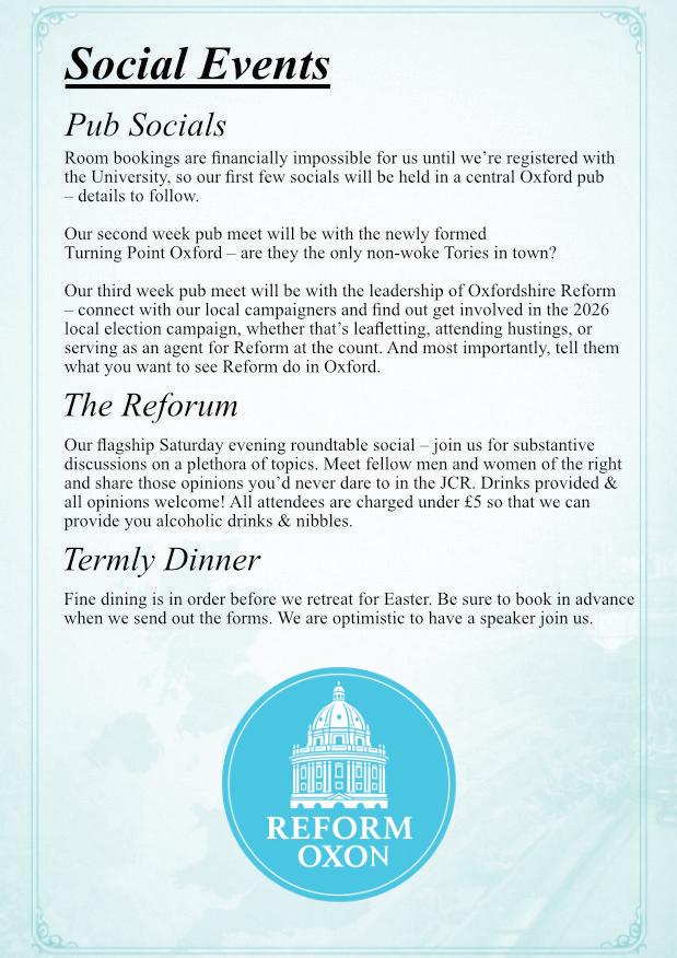 If you want to prevent Oxford from locking herself away in an ivory tower of opinions held only by a fast-diminishing footnote of radical progressives, if you want your University back like you want your country back, and if you want to meet and socialise with students who want the same: this is your home. Wherever you stand politically, if this sounds like your sort of thing, we’d love to meet you at one of our events and are certain you’ll fnd it worthwhile and a welcome break from the ‘business as usual’ of University life.