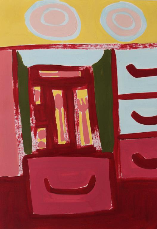 Here is my most recent list from my sketchbook; mint, red chilli, lemon, rug, send letter, rain, washing, vertical stripes I’ll choose a drawing or a list and I’ll start painting from them I never really know what’s going to happen but that can be nice It’s particularly nice when I feel like I have captured something special I have an appreciation for interiors and what people choose to surround themselves with If someone has a particularly memorable table cloth or candle stick-holder the likelihood of it ending up in one of my paintings is high.