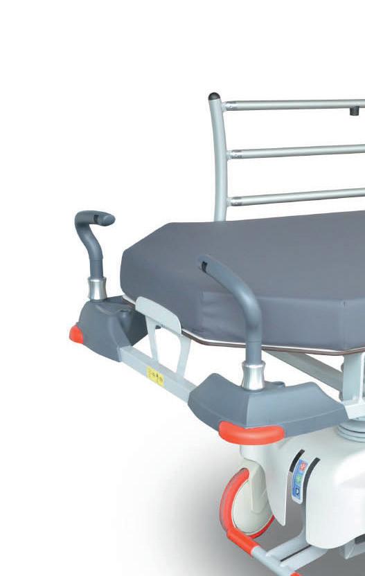 Ausgestattet mit zwei Drehachsen sind sie 10-mal widerstandsfähiger als der Standard. Der seitliche Knopf an der Fussseite ist für das Personal leicht zu positionieren und bleibt für den Patienten unzugänglich. Sie können unter der Liegefläche versenkt werden, um den Transfer zu erleichtern.
