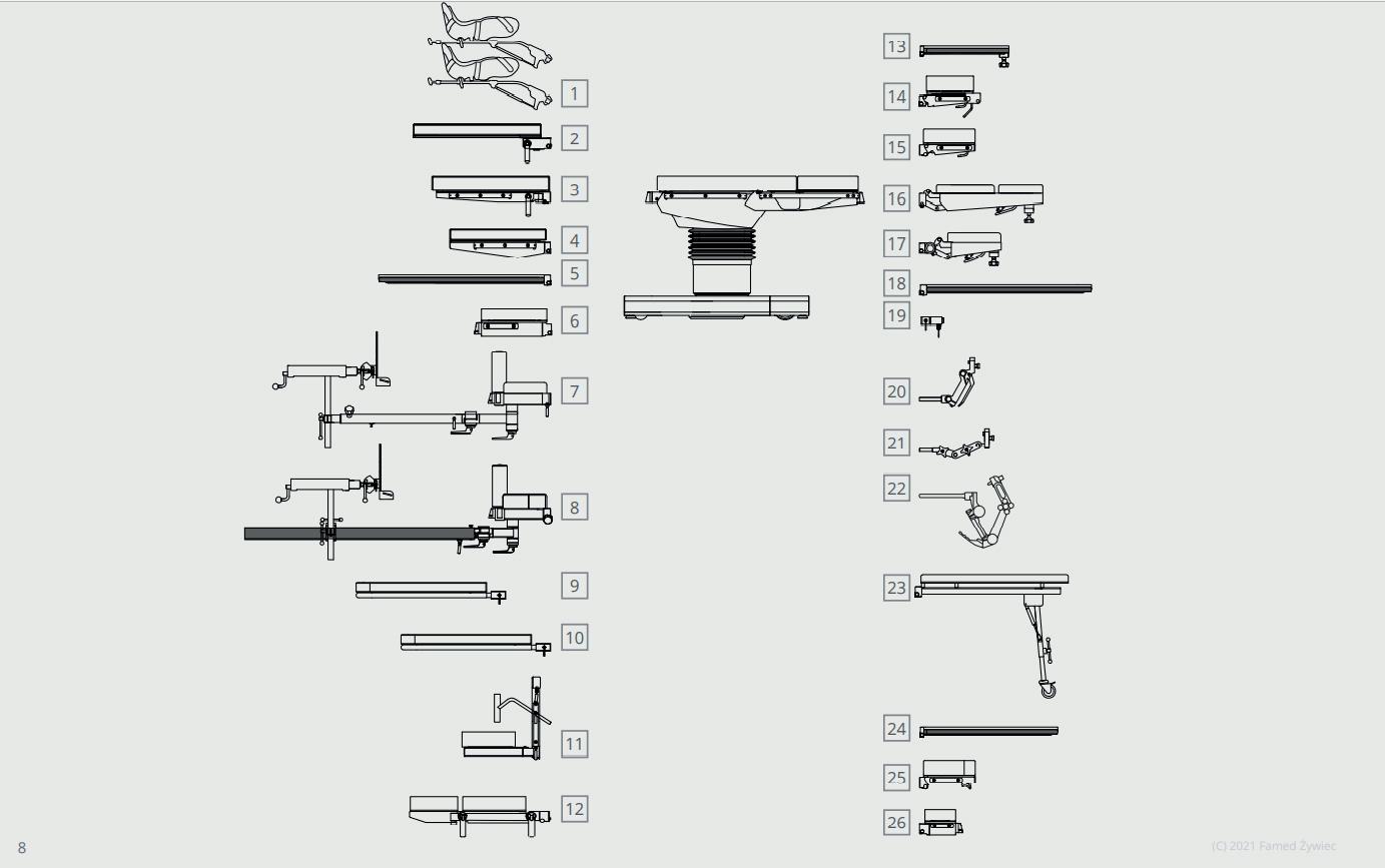 Die Tischplatte kann zerlegt und mit entsprechendem Zubehör für den Eingriff ausgestattet werden. Das Sortiment umfasst verschiedenen Carbon-Elementen, (mit oder ohne 360°-Bildgebung), Kopfstützen, neurologische Aufsätze, Rektalpositionierer, orthopädische Hilfsmittel oder gynäkologische Beinhalter. Ebenso verfügbar sind Verlängerungen und zusätzliche Sitzelemente.