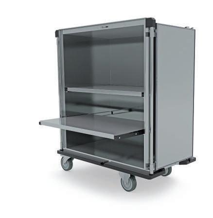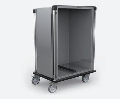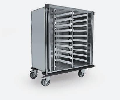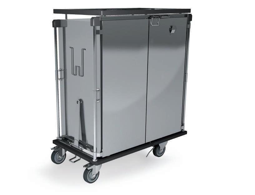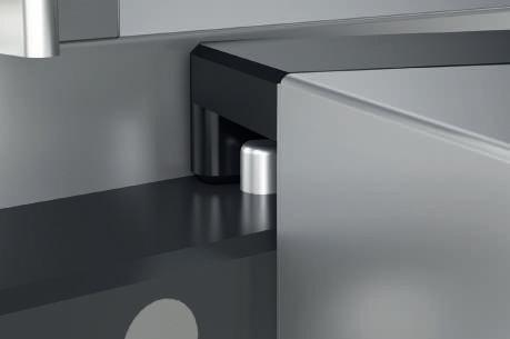 El cuerpo del carro está fabricado de una sóla pieza sin juntas. Sistema patentado de pliegue en los bordes, con bisagra de puerta que durante el proceso de cierre se integra en la propia estructura. Bisagras verticales continuas a todo lo alto del armario.