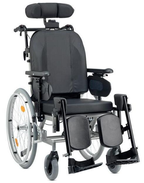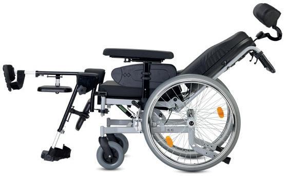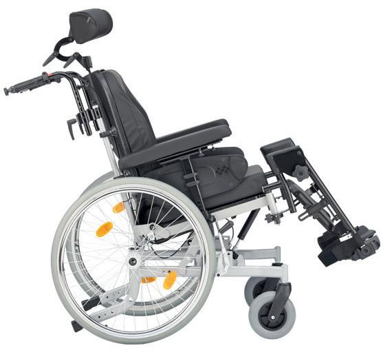 Die 3-fach verstellbare Kopfstütze, die höhen- und tiefenverstellbaren Seitenteile und die waagerecht verstellbaren Beinstützen mit manuellem Längenausgleich bieten weitere Anpassmöglichkeiten. Für noch mehr Beinfreiheit liegen hier die Beinstützenaufnahmen ausserhalb des Sitzrahmens.