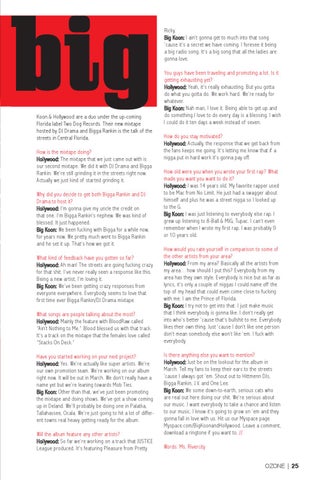 Ricky. Big Koon: I ain’t gonna get to much into that song ‘cause it’s a secret we have coming. I foresee it being a big radio song. It’s a big song that all the ladies are gonna love. You guys have been traveling and promoting a lot. Is it getting exhausting yet? Hollywood: Yeah, it’s really exhausting. But you gotta do what you gotta do. We work hard. We’re ready for whatever. Big Koon: Nah man, I love it. Being able to get up and do something I love to do every day is a blessing. I wish I could do it ten days a week instead of seven. How do you stay motivated? Hollywood: Actually, the response that we get back from the fans keeps me going. It’s letting me know that if a nigga put in hard work it’s gonna pay off. How old were you when you wrote your first rap? What made you want you want to do it? Hollywood: I was 14 years old. My favorite rapper used to be Mac from No Limit. He just had a swagger about himself and plus he was a street nigga so I looked up to the G. Big Koon: I was just listening to everybody else rap. I grew up listening to 8-Ball & MJG, Tupac. I can’t even remember when I wrote my first rap. I was probably 9 or 10 years old. How would you rate yourself in comparison to some of the other artists from your area? Hollywood: From my area? Basically all the artists from my area…how should I put this? Everybody from my area has they own style. Everybody is nice but as far as lyrics, it’s only a couple of niggas I could name off the top of my head that could even come close to fucking with me. I am the Prince of Florida. Big Koon: I try not to get into that. I just make music that I think everybody is gonna like. I don’t really get into who’s better ‘cause that’s bullshit to me. Everybody likes their own thing. Just ‘cause I don’t like one person don’t mean somebody else won’t like ‘em. I fuck with everybody. Is there anything else you want to mention? Hollywood: Just be on the lookout for the album in March. Tell my fans to keep their ears to the streets ‘cause I always got ‘em. Shout out to Hittmenn DJs, Bigga Rankin, J.V. and One Lee. Big Koon: We some down-to-earth, serious cats who are real out here doing our shit. We’re serious about our music. I want everybody to take a chance and listen to our music. I know it’s going to grow on ‘em and they gonna fall in love with us. Hit us our Myspace page Myspace.com/BigKoonandHollywood. Leave a comment, download a ringtone if you want to. // Words: Ms. Rivercity OZONE | 25