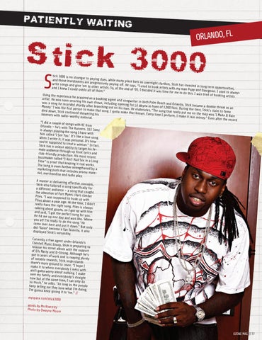 tick 3000 is no stran ge and those investme r to paying dues. While many place be nts ts on overnight sta rdom, Stick has inv write songs and giv are progressively paying off. He say ested in long term s, “I used to book e ‘em to other artist op artists with my ma s. So, at the end of and I knew I could n Pupp and Dawgma portunities, ‘05, I decided it wa outdo all of them. n. I used to always ” s time for me to do this. I was tired of Using the experienc booking artists e he acquired as a booking agent and artist. He was soon songwriter in both securing his own sh Palm Beach and Orl ows, including open was a song he record ando, Stick becam ing for Lil Wayne in ed shortly after bra e a do fro Money.’ I was the first person to make nching out on his own. He elaborates, nt of 3,000 fans. During the time, Sti uble threat as an ck’s claim to fame that song. I gotta “The song that rea died down, Stick co ma lly ntinued showering ke that known. Every put his listeners with radiotime I perform, I ma me on the map was ‘I Make It Rain worthy material. ke it rain money.” Even after the record “I did a couple of songs with KC from Orlando – he’s with Th is always playing the e Runners. 102 Jamz song I have with him called ‘I See Yo u.’ It’s like a love so ng. When I wrote it, it was personal. It’s how you’re supposed to treat a woman.” In fact, Stick has a unique ability to target his female audience thr ough up front lyrics and club-friendly produ ction. His most rec ent buzzmaker called “I Ain’t Had Sex in a Long Time” is proof that keeping it real wo rks. The song is even fur ther strengthened by marketing push tha t includes promo ma a terial, merchandise an d radio play. A master at deliveri ng effective concep ts, Stick also tailored a song specifically for a different audienc e – a song that cau ght the attention of Fo rt Myers chart climb er Plies. “I was suppo sed to hook up with Plies about a year ago. At the time, I didn’t really have the rig ht song. Plies is alw ays talking about goon s, so I got up with him and said, ‘I got the perfect song for yo u.’ He hit me up one da y and was like, ‘Wh ere you at? I’m ready to do the song.’ He came over here an d put it down.” No t only did “Goon” become a fan favorite, it als o displayed Stick’s ve rsatility. Currently a free ag ent under Orlando ’s Clientell Music Gro up, Sti release his street alb ck is preparing to um with the suppo rt of DJs Nasty and DStrong. Although he ’s put in years of wo rk and is reaping ple nty of notable rewards, Sti there’s more groun ck understands d to cover. “I hope I make it to where ev ery ain’t gotta worry ab body I mess with ou sure my family and t nothing. I make everybody’s straig ht now but at the sam e time, I can only do so much,” he adds . “As long as the pe ople keep telling me the y love what I’m do ing, I’m gonna keep giv ing it to ‘em.” // myspace.com/stick3