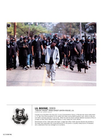 “FOR MY THUGS” video shoot (Baton rouge, la) PHOTO BY KING YELLA Coming up in Southern Hip Hop O.G. C-Loc’s Concentration Camp, Lil Boosie has never really been a “lil” guy. From the jumpstart of his career he’s been surrounded by grown men, which is why you can hear a certain maturity in his music. When he and his rhyme partner Webbie received a Pimp C co-sign on their 2003 Ghetto Stories album, it only made him more official. Reminiscent of the “little dude with heart” image that 2Pac made popular, Boosie has birthed a fan base that resembles the crowd behind him in this photo: a usually rowdy bunch of followers who understand that true strength is in numbers.