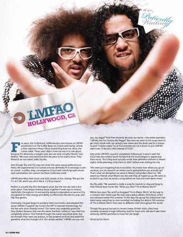 or years, the Hollywood, California duo now known as LMFAO would kick it at The Coffee Bean on Sunset and Fairfax, where a then unknown Perez Hilton would blog from his office, the corner table. “Perez and I didn’t have too much to talk about, because I’m obviously a straight man, but we were actually friends,” says Redfoo. “We even watched them film the pilot to his reality show. They filmed it on our street,” adds Sky Blu. And though Sky and Foo may not share the same sexual preference as Perez, the experimental DJs-turned-emcees definitely fit in amongst a similar crowd - a coffee shop convergence of loud and colorful people whose style summarizes the current Southern California scene. LMFAO describes their music and style simply as fun, stating, “We put the F.U. in FUN, and if you don’t like it, F.U.’N ya mama.” Redfoo is actually Sky Blu’s biological uncle, but the two are only a few years apart. They began making music together 4 years ago in various nightclubs throughout LA and quickly earned a reputation as raucous DJs, recognized for their energy and ability to effectively mix electro, pop, and Hip Hop genres. Eventually, the pair began to produce their own tracks, and adopted the name LMFAO (“Laughin’ My Fuckin’ Ass Off” in internet terminology, for the few who don’t already know). “Our name was originally gonna be Sexy Dudes, because that was the name that best suited us,” says Red Foo, completely serious. “Our friends thought the name was kinda lame, but we thought they were just jealous, so Sky jumped on iChat and asked his grandma what she thought of it. She simply replied, “LMFAO, are you seri-