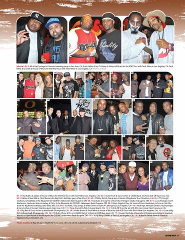 01 // Krizz Kaliko & ladies @ House of Blues for the KOD Tour with Tech N9ne (Los Angeles, CA) 02 // Audio Push & Gary Archer @ UGMX Back 2 School Jerk Off (San Jose, CA) 03 // Kafani & Steal Will @ Club Illusions for Big Rich’s birthday party (Palo Alto, CA) 04 // Philthy Rich & Stevie Joe @ Giants & Elephants Tour (Stockton, CA) 05 // TO, Yung If, Starbuks, & TrealKikz @ the Blueprint for OZONE’s Halloween Bash (Eugene, OR) 06 // Starbuks & Yung If @ University of Oregon stadium (Eugene, OR) 07 // Lucas Risinger, Scott Masterson, Starbuks, Marvin Harley, & Dirty @ the Blueprint for OZONE’s Halloween Bash (Eugene, OR) 08 // Brian Angel of Day 26, Scoot of Dem Hoodstarz, & Cam @ Club Illusions for Big Rich’s birthday party (Palo Alto, CA) 09 // Jay Rock, Trey Songz, & Mike Green @ Styles P’s afterparty (Los Angeles, CA) 10 // Nick Ngo, Michael Denton, Haji Springer, & Gary Archer @ Nump’s listening party (San Jose, CA) 11 // Tone, Roccett & Rob G (Long Beach, CA) 12 // E-40 & DB’Z on the set of E-40’s mini movie (San Francisco, CA) 13 // Big Rich & Gary Archer @ Boardwalk (Orangevale, CA) 14 // Violet Brown & Tech N9ne @ House of Blues for the KOD Tour with Tech N9ne (Los Angeles, CA) 15 // Guce & Big Rich @ Boardwalk (Orangevale, CA) 16 // DJ Baby Chino & D-Lo @ UGMX Back 2 School Jerk Off (San Jose, CA) 17 // Guest, Starbuks, University of Oregon quarterback Jeremiah Masoli, & Elijah Masoli @ the Blueprint for OZONE’s Halloween Bash (Eugene, OR) 18 // Yung Berg & ladies @ Tatou (Los Angeles, CA) 19 // Kafani & Dame Fame @ Giants & Elephants Tour (Stockton, CA) Photo Credits: D-Ray (01,02,03,04,08,09,10,11,12,13,14,15,16,18,19); Julia Beverly (05,06,07,17)