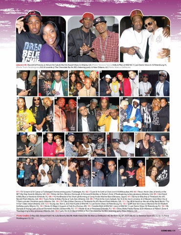 01 // DJ Scream & DJ Caesar @ Tuskeegee’s homecoming party (Tuskeegee, AL) 02 // Guest & Yo Gotti @ Club Live 618 (Milwaukee, WI) 03 // Rosci, Kevin Liles, & family @ the BET Hip Hop Awards (Atlanta, GA) 04 // Polow da Don, Monica, Dorrough, & Fonsworth Bentley @ Polow’s Zone 4 Thanksgiving turkey giveaway (Atlanta, GA) 05 // Ace Hood & Billy Blue @ Firestone (Orlando, FL) 06 // H2 Hardheadz & Too $hort performing @ Camp Foster Marine Base (Okinawa, Japan) 07 // Bama & Alley Boy @ Throbacks for ATL Record Pool (Atlanta, GA) 08 // Travis Porter & Waka Flocka @ Sub Zero (Atlanta, GA) 09 // T-Pain & his mom Aaliyah, Ne-Yo & his mom Lorraine, & Lil Wayne’s mom Miss Cita @ T-Pain’s private Christmas party (Atlanta, GA) 10 // DJ T-Roc & Marc Decoca @ Throbacks for ATL Record Pool (Atlanta, GA) 11 // Sig HB & Kandi on the set of Big Bank Black’s “Try It Out” video shoot (Atlanta, GA) 12 // Young Joe, Tom G, & DJ Kid Hustle @ Wild 94.1’s Last Damn Show (St Petersburg, FL) 13 // Spliff Starr & E-Class @ Mansion for DJ Khaled’s birthday party (Miami, FL) 14 // Gloria, DJ Bigg V, & guest @ Club Era (Dumas, AR) 15 // Goodie Mob & Wild 94.1 crew @ Wild 94.1’s Last Damn Show (St Petersburg, FL) 16 // Ms Dynasty & Young Cash @ Duval Diamond Awards (Jacksonville, FL) 17 // Bizzle & Lex @ Firestone (Orlando, FL) 18 // Dose, Waka Flocka Flame, & DJ Infamous @ Polow’s Zone 4 Thanksgiving turkey giveaway (Atlanta, GA) 19 // Lady Alvi & DJ Black N Mild @ The Chocolate Bar for BG’s listening party (New Orleans, LA) Photo Credits: D-Ray (02); Edward Hall (14); Julia Beverly (06,09); Malik Abdul (04,18); Marcus DeWayne (19); Ms Rivercity (01,03,07,08,10,11); Terrence Tyson (05,13,16,17); Travis Pendergrass (12,15)