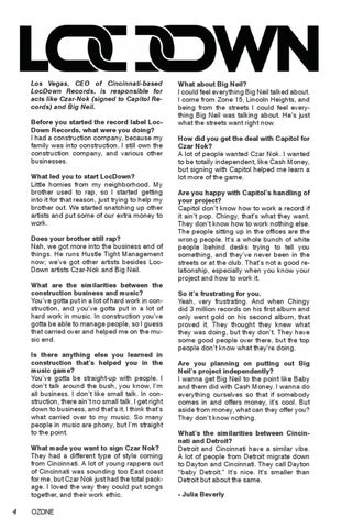 Los Vegas, CEO of Cincinnati-based LocDown Records, is responsible for acts like Czar-Nok (signed to Capitol Records) and Big Neil. Before you started the record label LocDown Records, what were you doing? I had a construction company, because my family was into construction. I still own the construction company, and various other businesses. What led you to start LocDown? Little homies from my neighborhood. My brother used to rap, so I started getting into it for that reason, just trying to help my brother out. We started snatching up other artists and put some of our extra money to work. Does your brother still rap? Nah, we got more into the business end of things. He runs Hustle Tight Management now; we’ve got other artists besides LocDown artists Czar-Nok and Big Neil. What are the similarities between the construction business and music? You’ve gotta put in a lot of hard work in construction, and you’ve gotta put in a lot of hard work in music. In construction you’ve gotta be able to manage people, so I guess that carried over and helped me on the music end. Is there anything else you learned in construction that’s helped you in the music game? You’ve gotta be straight-up with people. I don’t talk around the bush, you know, I’m all business. I don’t like small talk. In construction, there ain’t no small talk. I get right down to business, and that’s it. I think that’s what carried over to my music. So many people in music are phony, but I’m straight to the point. What made you want to sign Czar Nok? They had a different type of style coming from Cincinnati. A lot of young rappers out of Cincinnati was sounding too East coast for me, but Czar Nok just had the total package. I loved the way they could put songs together, and their work ethic.