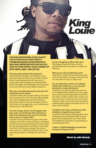 King Louie CHICAGO NATIVE KING LOUIE CAUGHT THE ATTENTION OF KANYE WEST’S FORMER MANAGER JOHN MONOPOLY, WHO WAS IMPRESSED WITH HIS HUSTLE AND YOUTUBE VIDEOS. SINCE LINKING UP WITH INDIE LABEL LAWLESS INC How’d you get started in the rap game? I got kicked out of high school during my last year and I had more time on my hands, so that’s when I started going hard with rap music. A couple years later I bumped into [Kanye West’s former manager] John Monopoly. He introduced me to Larro and [my record label] Lawless Inc. Were you a troublemaker back in the day? Getting kicked out of school? I wouldn’t really call it trouble-making. You know how young men are. The school would probably say I was a troublemaker, but I don’t think so. These days I tend to woo-sah through my lyrics. That’s how I let my aggression out, I smoke something and just chill and write. Common, Kanye, there’s a lot of rappers who have come out of Chicago with substance in their music. Would you say you’re in a similar lane or more on a party vibe? I wouldn’t even put those two guys in the same category. Common is more conscious, and Kanye can get conscious sometimes but he’s more what the younger generation would like to hear while Common is for the grown people. My music is more street. It’s a little more grimy. To me, it’s my personal perception of Chicago. It’s real hood, man.