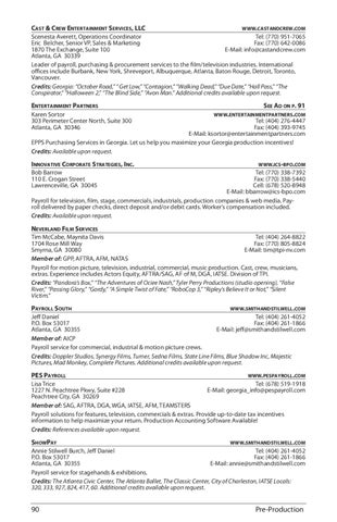 Entertainment Partners See Ad on p. 91 Karen Sortor www.entertainmentpartners.com 303 Perimeter Center North, Suite 300 Tel: (404) 276-4447 Atlanta, GA 30346 Fax: (404) 393-9745 E-Mail: ksortor@entertainmentpartners.com EPPS Purchasing Services in Georgia. Let us help you maximize your Georgia production incentives! Credits: Available upon request.