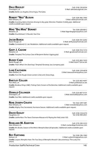 Tel: (504) 296-1960 Kenner, LA E-Mail: royfartrhing@yahoo.com Credits: Looper; Memphis Heat: The True Story of Memphis Wrasslin’ (documentary); The Lucky One (short).