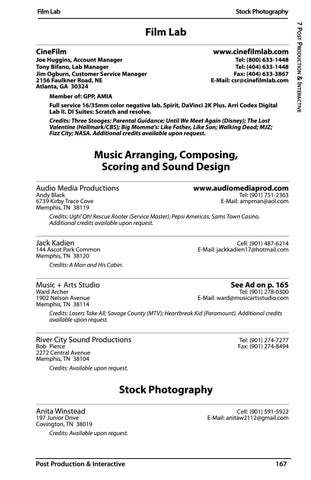 Joe Huggins, Account Manager Tel: (800) 633-1448 Tony Bifano, Lab Manager Tel: (404) 633-1448 Jim Ogburn, Customer Service Manager Fax: (404) 633-3867 2156 Faulkner Road, NE E-Mail: csr@cinefilmlab.com Atlanta, GA 30324 Member of: GPP, AMIA Full service 16/35mm color negative lab. Spirit, DaVinci 2K Plus. Arri Codex Digital Lab II. DI Suites: Scratch and resolve. Credits: Three Stooges; Parental Guidance; Until We Meet Again (Disney); The Lost Valentine (Hallmark/CBS); Big Momma’s: Like Father, Like Son; Walking Dead; MJZ; Fizz City; NASA. Additional credits available upon request.