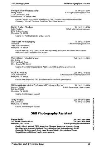 Trey Clark Photography Tel: (901) 278-5744 Trey Clark E-Mail: trey@treyclark.com 1460 Madison Avenue Memphis, TN 38104 Credits: Meet the Lucky Ones (Lincoln Mercury); Lovely By Surprise (Kirt Gunn); Verso Papers. Additional credits available upon request. VideoVision Entertainment Cell: (901) 331-3766 Kim Smith 7141 Hardwick Drive Olive Branch, TN 38654 Credits: Dream Star (independent). Additional credits available upon request. Mark H. Wilkins Cell: (901) 340-8790 3430 Joslyn Street E-Mail: soundhoundone@gmail.com Memphis, TN 38128 Credits: Book Magazine; P.B.S. Additional credits available upon request. Williams & Associates Professional Photography, Inc.