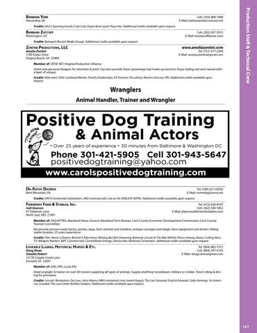 Member of: SAG/AFTRA, Maryland Horse Council, Maryland Farm Bureau, Cecil County Economic Development Commission, Cecil County Tourism Committee We provide picture-ready horses, ponies, dogs, farm animals and handlers, antique carriages and sleigh, farm equipment and drivers. Riding stable location. 25 years experience. Credits: Film: Never a Dream, Behold A Pale Horse; Waving But Not Drowning; Beloved; Lincoln & The War Within; Prince Among Slaves; Culling Hens. TV: Weapon Masters; MPT. Commercials: Constellation Energy; Democratic National Convention. Additional credits available upon request.
