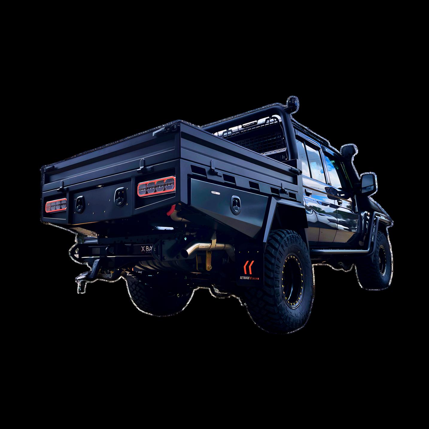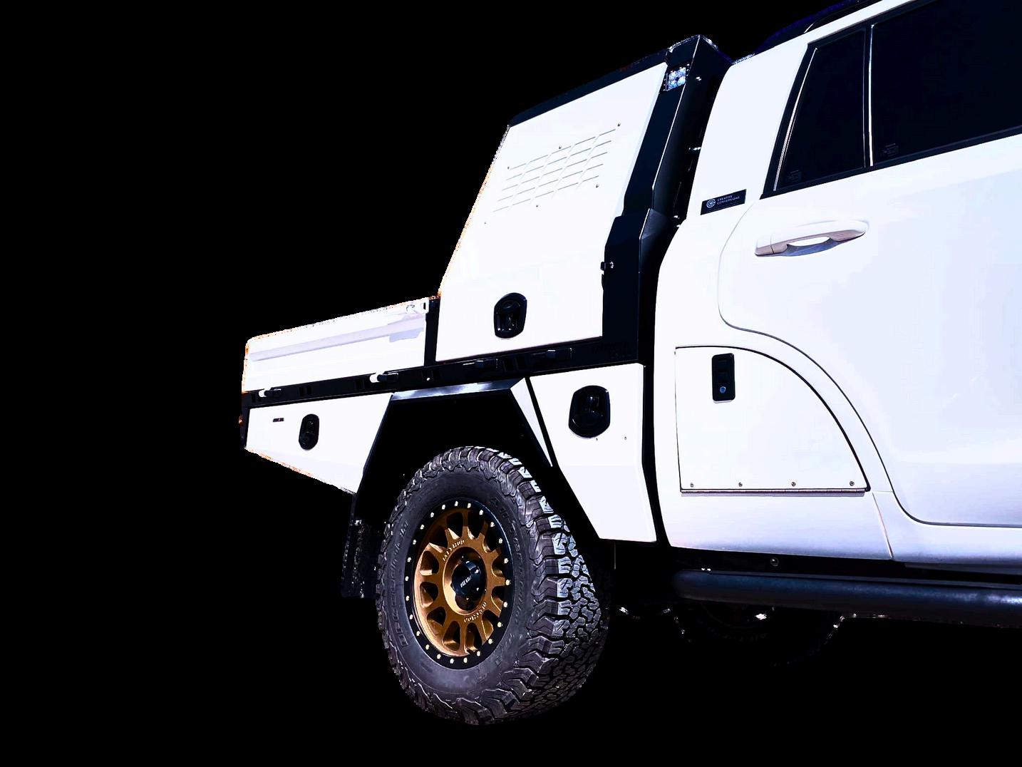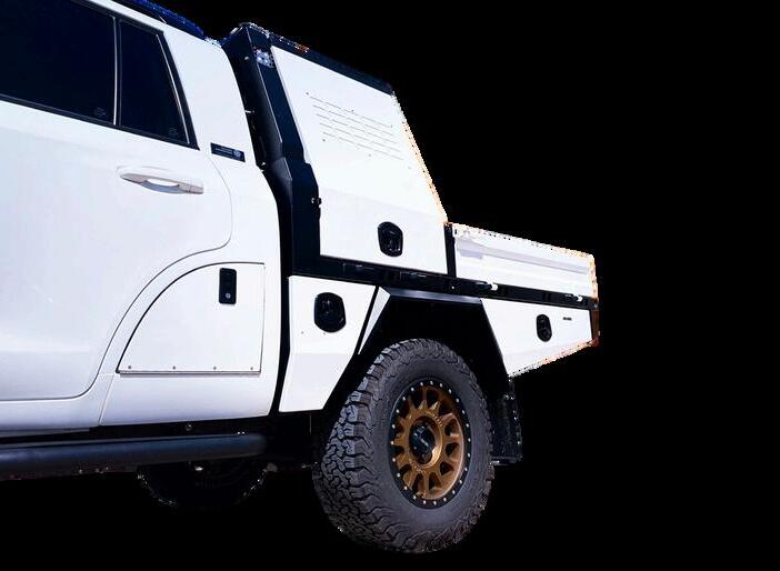 A Standard INCLUSION of our trays ARE OUR sleek double tapered under-tray toolboxes and the modern finish in Textura Black Powder coating For those seeking to personalize further, we offer a range of additional finishes to choose from along with a full range of options to choose for your tray or canopy