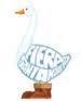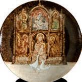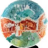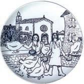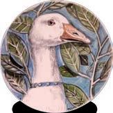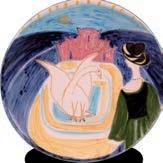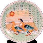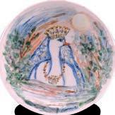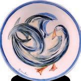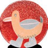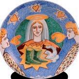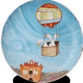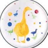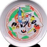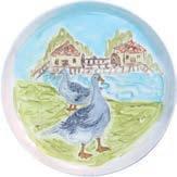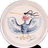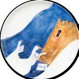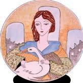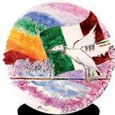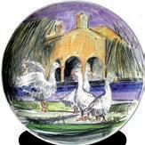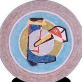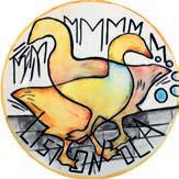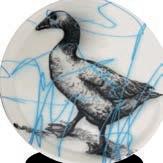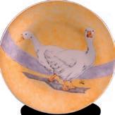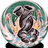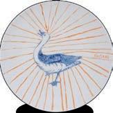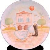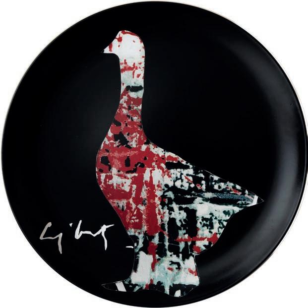 Grazie alla nostra Fiera del Patrono anche l’oca è entrata nel bestiario immaginario di Giorgio Celiberti. Ma, se fino ad oggi la rappresentazione degli animali (cavalli, gufi, colombe, corvi, pecore, capre e leoni) era confinata nei volumi della scultura in bronzo, l’oca qui si presta invece ad una sorta di antologia dei temi pittorici e delle scelte cromatiche del grande artista friulano. Ed ecco che compaiono sulla sagoma del palmipede i cuori, le farfalle, i colori, le gestualità che compongono il linguaggio inimitabile di Giorgio Celiberti, maturato e raffinato in decenni e decenni di sperimen tazione e ricerca. Il pittore compie proprio in questi giorni, il 19 novembre, i suoi 93 anni e la sua creatività appare ancora viva ed intatta. È stato il più giovane artista ad aver esposto alla Biennale di Venezia, proprio in quella importante del ’48, e non aveva ancora diciannove anni. Proprio qualche settimana fa la Biennale stessa gli ha dedicato una giornata di studio e di approfondimento. Lì nella città lagunare dove si era formato accanto ai Vedova, ai Tancredi, ai Ciussi. Davvero chi si aggiudica uno di questi 6 piatti può dire di portarsi a casa un piccolo compendio della pittura italiana del XX secolo, e non solo, ma anche il frammento di una lunga vita tutta dedicata all’arte.