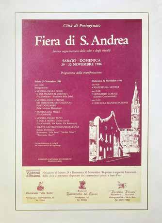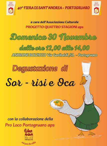 scuole primarie per celebrare la quarantesima edizione della Fiera e le sue origini; alla Galleria d’Arte Contemporanea Ai Molini è allestita “Venetian heritage meets contemporary design”, mostra di VENEDIA DESIGN che porta l’eleganza e la storia veneziana nel design contemporaneo, valorizzando l’artigianalità unica dell’area delle “Tre Venezie”; sempre alla Galleria d’Arte Contemporanea Ai Molini e presso l’Androne Bolzicco (Via Garibaldi 51) si trova esposta “Acqua, Stivali e Oche”, collettiva di artisti a cura dell’Associazione Pro Loco Portogruaro; infine, a Palazzo Michielli (Corso Martiri della Libertà 106) trova spazio “Turismo e(è) Cultura”, esposizione di TVO/InfoPoint Turistico della Città, per conoscere il territorio e promuoverlo valorizzandone le risorse locali, anche attraverso delle visite guidate tematiche. Ma chiaramente non finisce qui. Giostre, bancarelle, piatti a base di oca, concerti, esibizioni sportive, visite guidate, spettacoli di giocoleria e attrazioni per i più piccoli, mostre, iniziative culturali e di beneficenza… e molto altro ancora. La Fiera di Sant’Adrea si conferma quindi uno dei più importanti appuntamenti fieristici del territorio, dalla forte valenza tradizionale, in grado di attrarre migliaia di visitatori e di fungere da importante vetrina per le nostre eccellenze. Ringraziamo quindi l’Amministrazione comunale per avere ancora una volta riposto in noi la sua fiducia e tutti quei soggetti che hanno collaborato per rendere l’appuntamento indimenticabile.