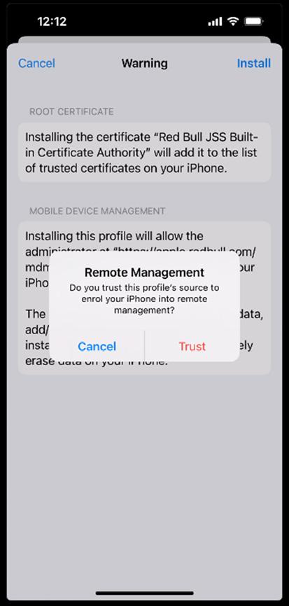 After the installation is finished, tap Done. Again, tap Install. Tap Dismiss and then Install for both pop ups. Choose Trust.