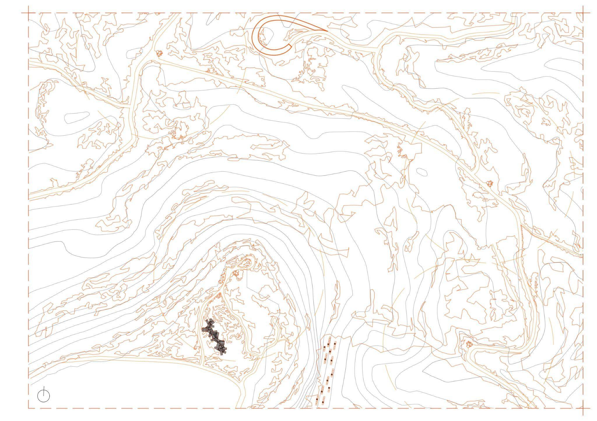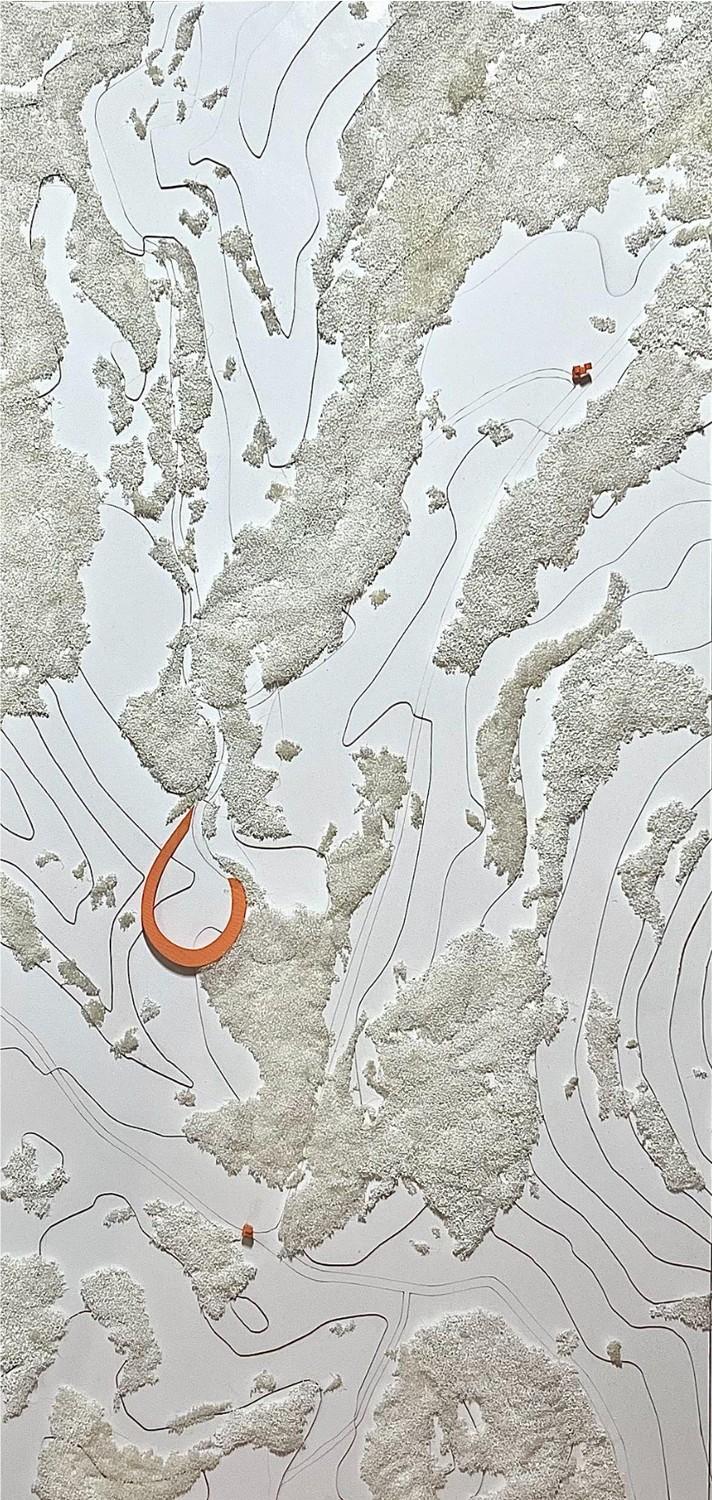 A diferencia de los planes colaborativos habituales que se centran en la extensa y fértil llanura productiva, nuestra propuesta se adentra en la región más montañosa y abrupta de la comarca. Aquí, llevamos a cabo una intervención de gran valor en todos los senderos que atraviesan los bosques, aquellas rutas ciclistas que enlazan el territorio. Son estos caminos los que sustentan nuestra respuesta al enunciado. No obstante, nuestras propuestas dialogan de manera distinta con el paisaje. En el corazón del bosque, se oculta uno de los proyectos, mimetizado entre la vegetación. Con respecto a la topografía, una serie de cápsulas de geógrafos se adosan majestuosamente al gran paredón. Y hay dos proyectos que se integran al camino, formando parte intrínseca de él y abrazando la idea de movilidad. Estos tres factores —la invisibilidad del proyecto en el bosque, la adhesión topográfica de las cápsulas y la integración dinámica de los caminos— son los que definen este paisaje único y extraordinario.