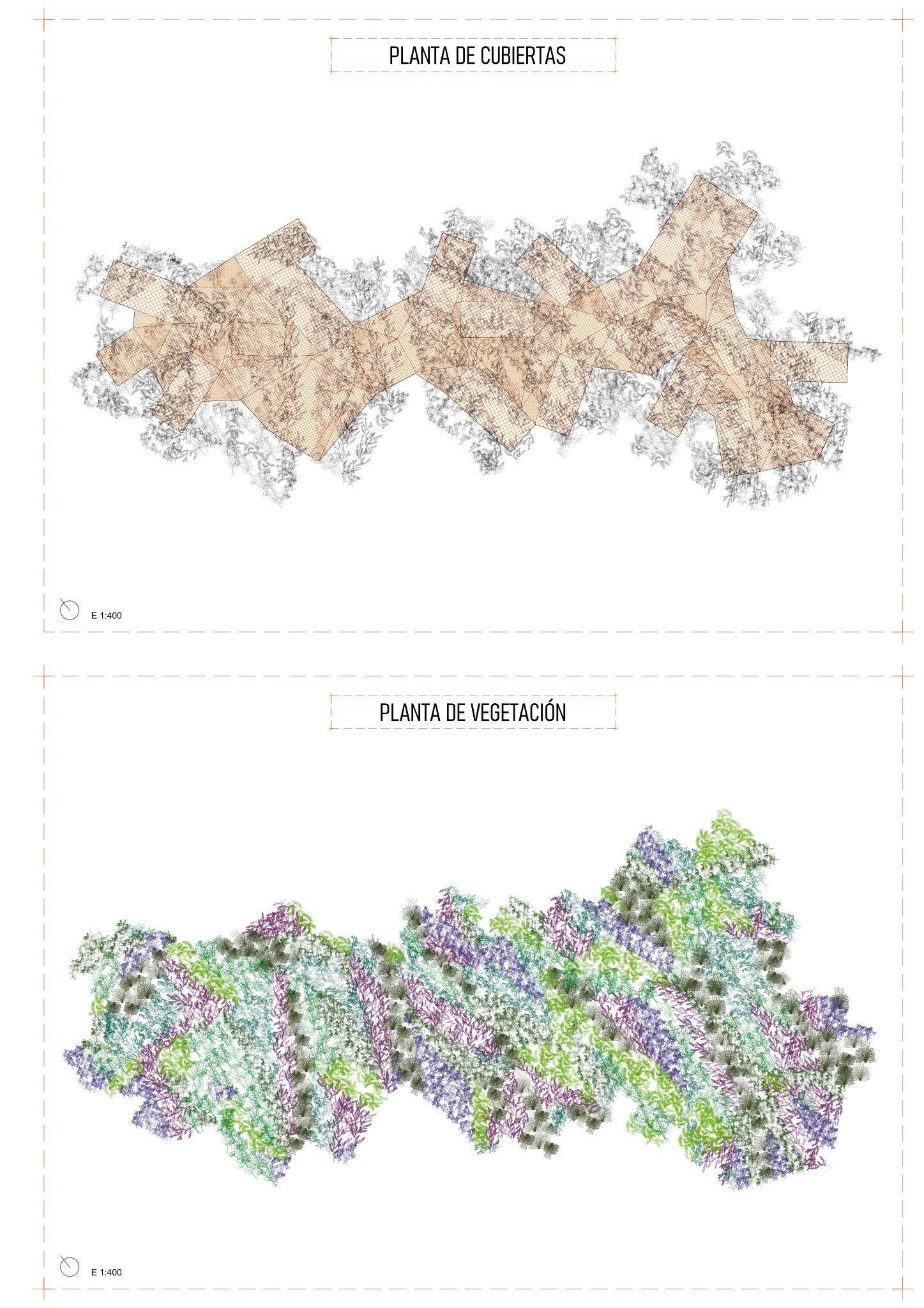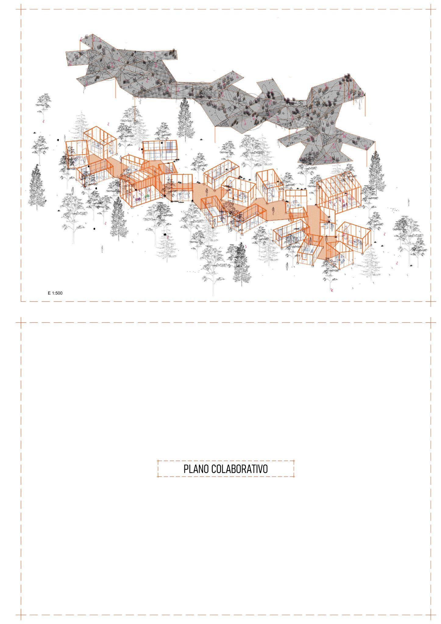 El proyecto se erige como una estructura orgánica que se adapta armoniosamente a los árboles, configurando espacios entre sus troncos y creando múltiples configuraciones gracias a la flexibilidad de su sistema modular prefabricado,lo que permite uncambio constante y fluido. Este espacio es un laboratorio fitopatológico dedicado al estudio de plantas invasoras encontradas en la comarca. Dentro de esta estructura, se despliegan diversos espacios de estudio e investigación. Los laboratorios, situados en el interior de una red intricada, constituyenelnúcleodelainvestigación.