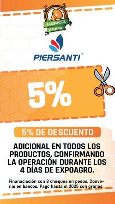 para la compra de hacienda durante los remates ganaderos de la expo. En Expoagro también estará Banco Comafi, que dará a conocer su nueva unidad de negocios Comafi Agro, con ofertas de financiamiento con préstamos prendarios o leasing para la compra de maquinarias agrícolas, líneas para compra de hacienda, préstamos con garantía SGR y acceso al mercado de valores a través de Comafi Bursátil. Por último, Banco Credicoop tendrá disponible la Tarjeta AgroCabal, con financiación de hasta 1 año de plazo, cobertura en todo el país, y convenios de hasta 270 días. Tendrá acuerdos especiales con consignatarios adheridos en el Remate del Rosgan, el miércoles 6. Además, dispondrá de descuento de cheques de pago diferido; créditos para adquisición de bienes de capital; y Leasing Credicoop: 31 meses para rodados y maquinaria vial, y 49 meses para maquinaria agrícola.