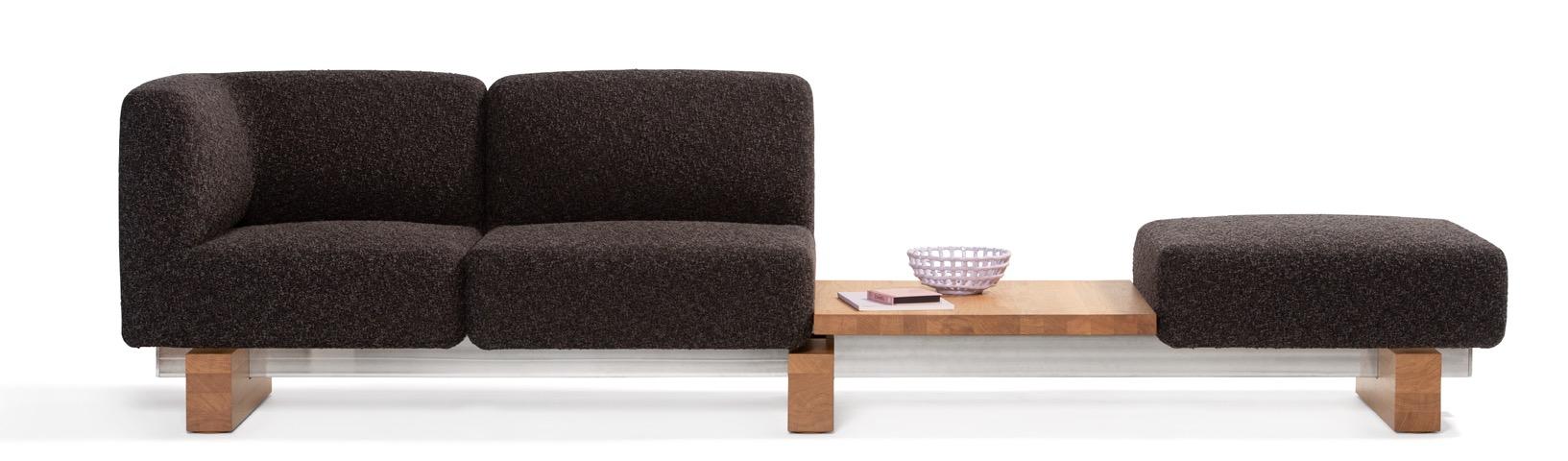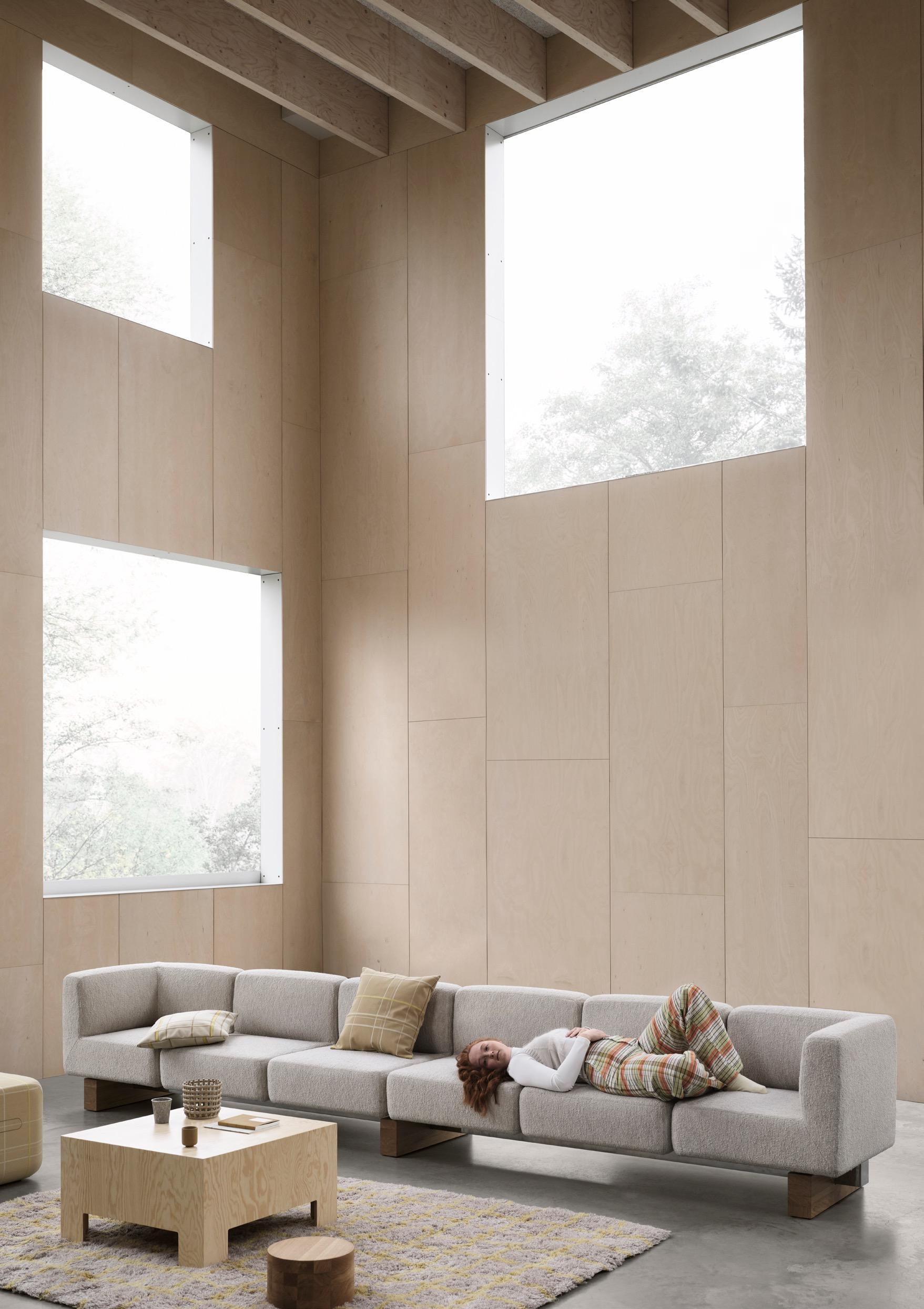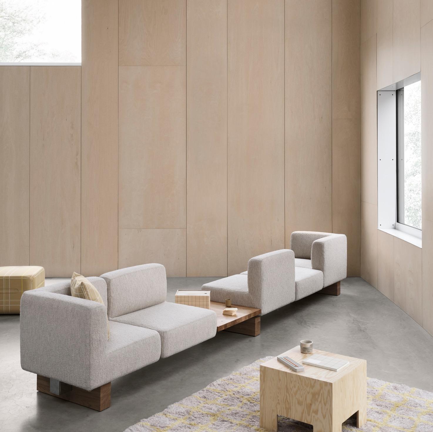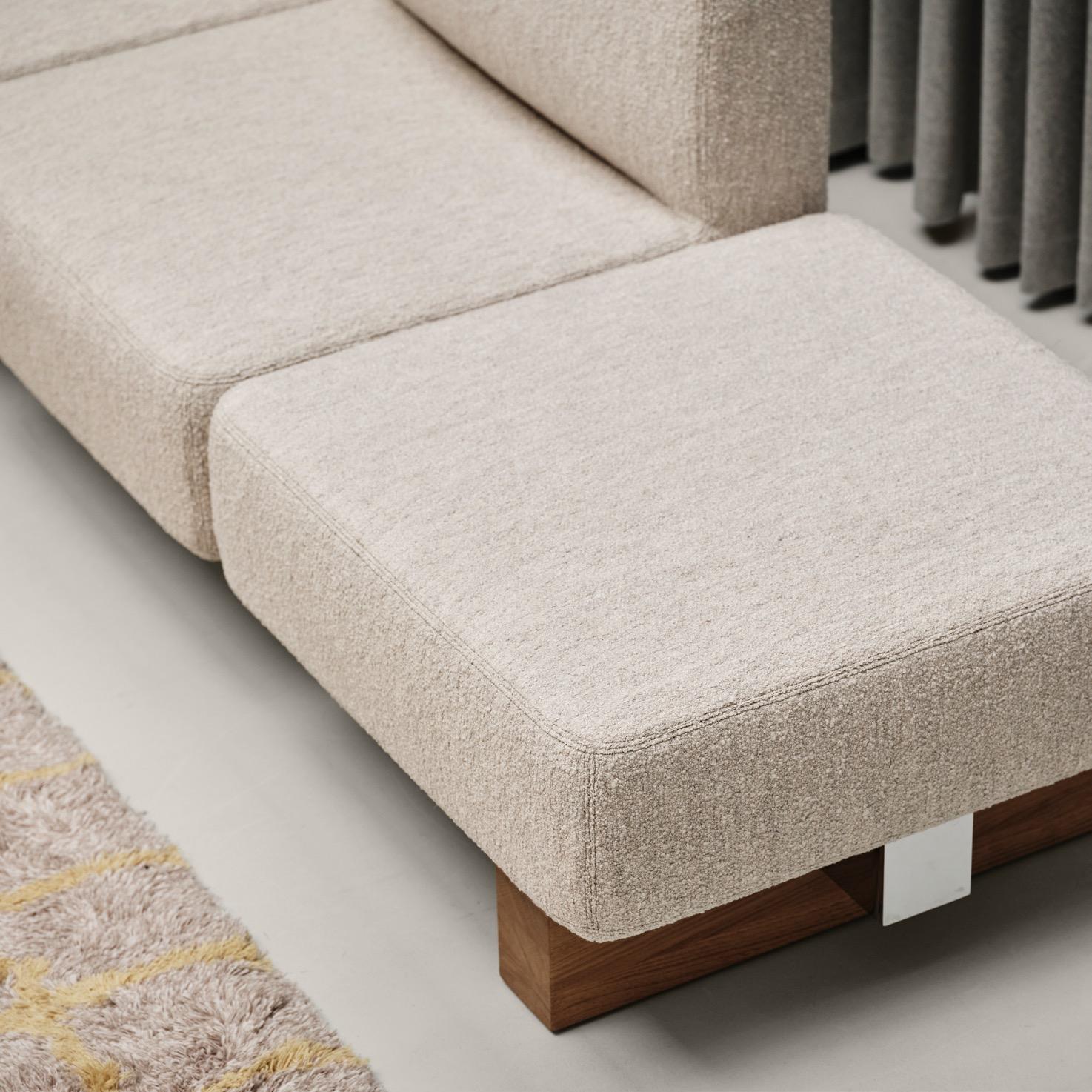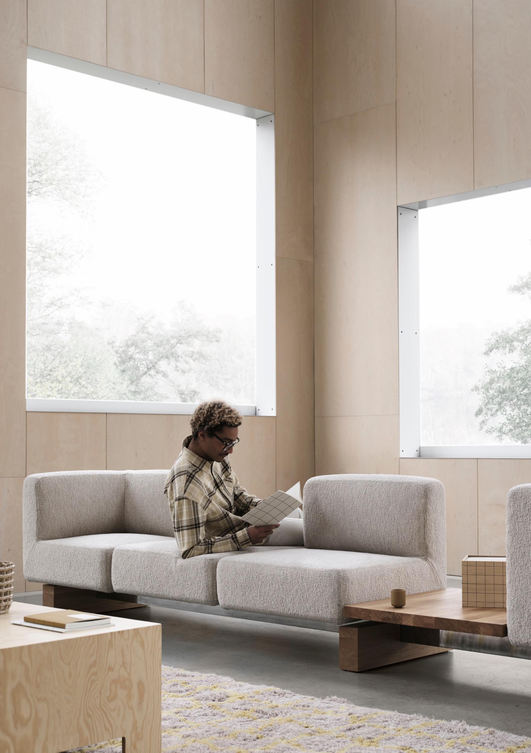 Meet RUT, a square sofa system. Each module is 750 x 750 centimeters. Causal and inviting. Or sober and formal. Rut seems like a well-known acquaintance but is a brand new companion. Opt for a laid-back space in one direction: perfect for reading a book, surfing the net, watching a movie, chatting with friends. Bernstrand and Borselius latest modular sofa for Blå Station offer elegant contrast between soft, comfortable and generous seating modules, and a sturdy exposed linear basement made of a steel H-beam resting on two, or more, solid oak supports. Assemble as many squares as needed. Turn them to the right, to the left, or all way around to offer different seating possibilities: affix with two bolts.