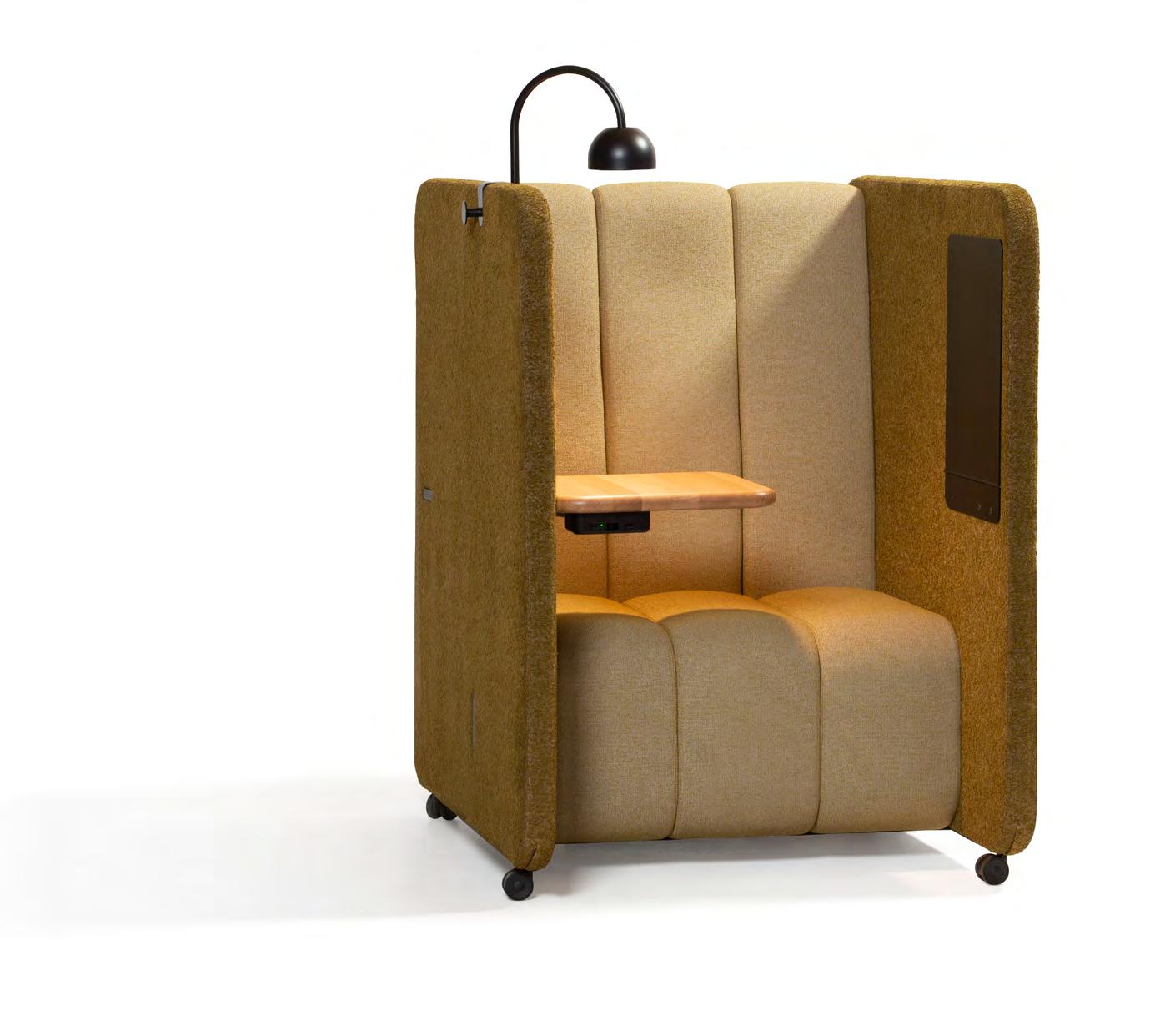 BOB is coming up with a new offspring in BOB SOLO, that can be kept close by or left free to roam about independently on its own. Two comfortably padded screens enclose the cubicle’s lush seatings and complimentary armrests. Stefan Borselius and Thomas Bernstrand have put small but strong wheels underneath to let BOB Solo go anywhere. And there will be no unnecessary extension cables to trip over thanks to a detachable power bank that will charge smartphones wirelessly along with laptops, as well as the BOB Light Mini. The small table in massive oak is perfect for a laptop, a book, and documents. Smaller shelves, coat hooks, mug holders along with a foldable rectangular steel table are at hand whenever needed. ‘BOB Solo is a room in the room, a nook for privacy,’ says Stefan Borselius who together with Thomas Bernstrand have created a fully independent addition to a now even more versatile sofa system.