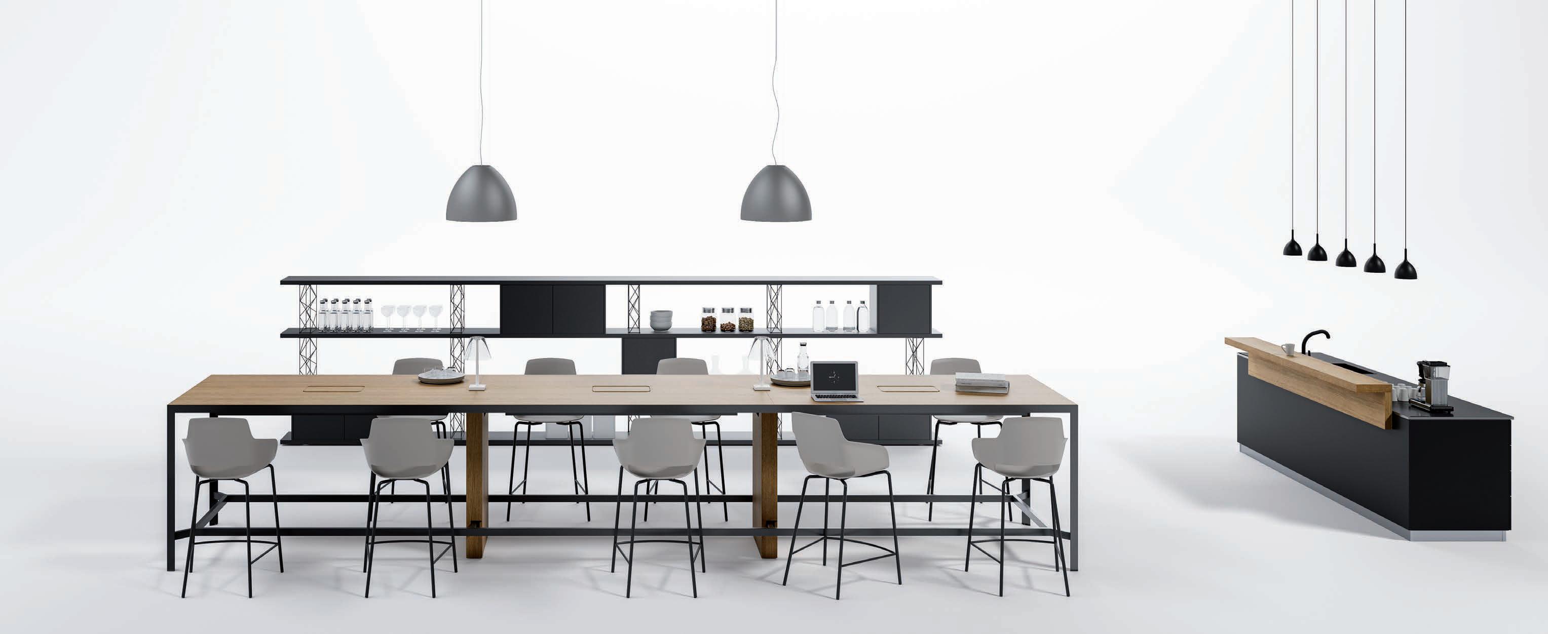 EN Frame Evo, in the high version, becomes the protagonist of a convivial space, featured by a warm and engaging atmosphere. The metal structure with oak top creates an ideal arrangement with the lamps, the bookcase and the stools of the Sinetica collection.
