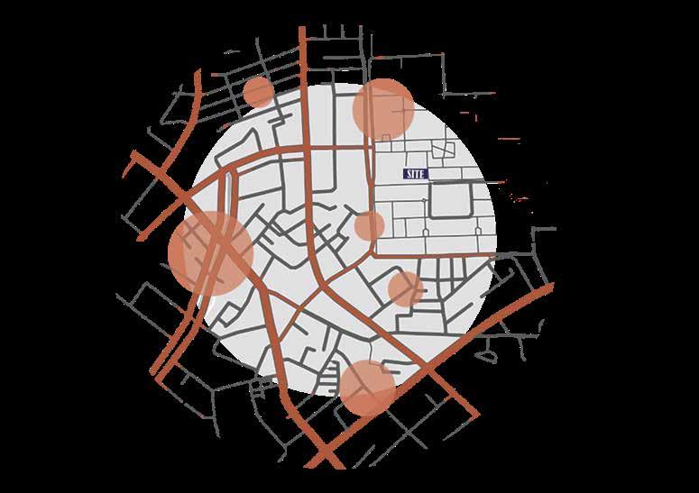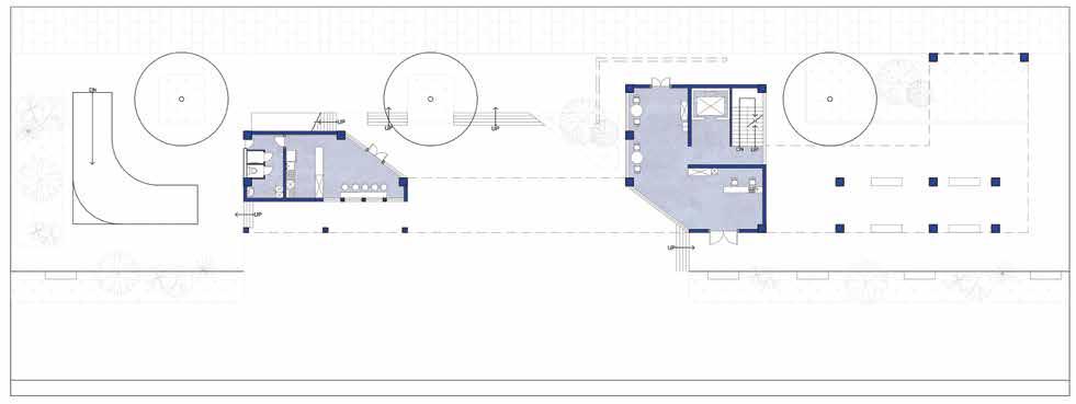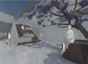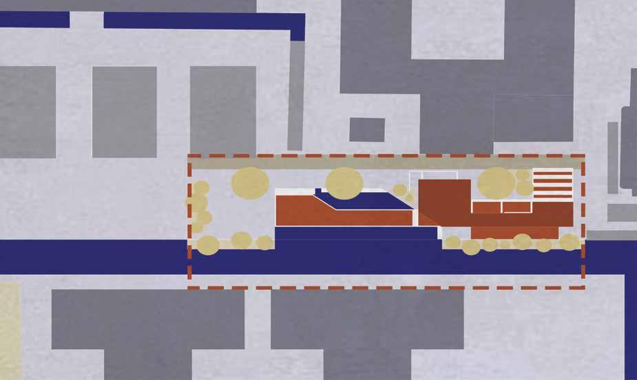 基地裡外高差有90公分,要形成新的邊界,需化解高度差距,並且需吸引更多 的人潮,需打造能讓人自由活動的場域,並運用路徑使人駐足並停留,並與附 近植栽連結,打造植帶的串聯