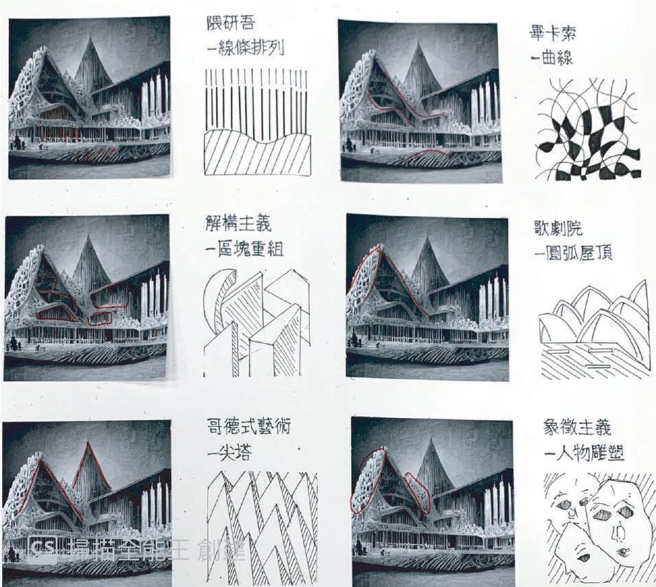 屋頂及牆上刻滿了各式各樣的人物雕塑,帶給人們神秘和些許詭譎的氣氛, 建築物由許多的塊狀和線條交雜而成,當風吹過時,總會發出恐怖且詭異的聲響, 宛如一首淒涼的悲歌,使人不敢靠近。