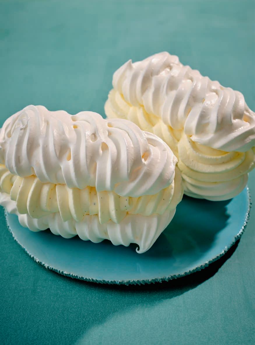 3 Doe de meringue in een spuitzak met een gekarteld spuitmondje van 1½ centimeter. Spuit op de bakplaat langwerpige meringues van zo’n 4-4½ centimeter breed en 8 centimeter lang. Draai tijdens het opspuiten met de spuitzak kleine rondjes, zodat je spiraalvormige meringues krijgt.