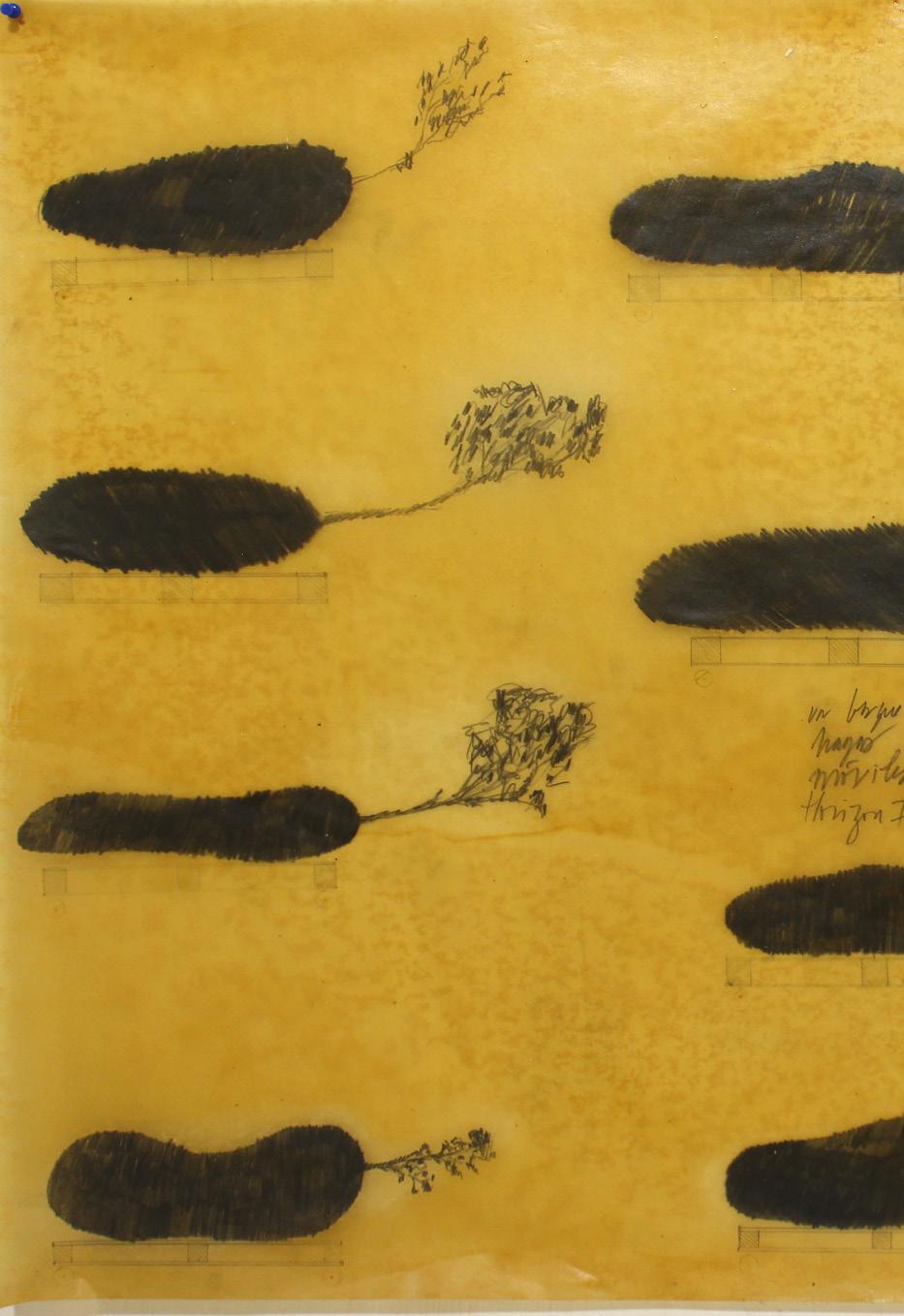 Bosque Negro, la linea horizontal, se trata de un numero determinado de crizalidas o “pupas”, como se les conoce coloquialmente, dispuestas en posición horizontal” en las que que están plantados árboles nativos de la zona central de Chile.
