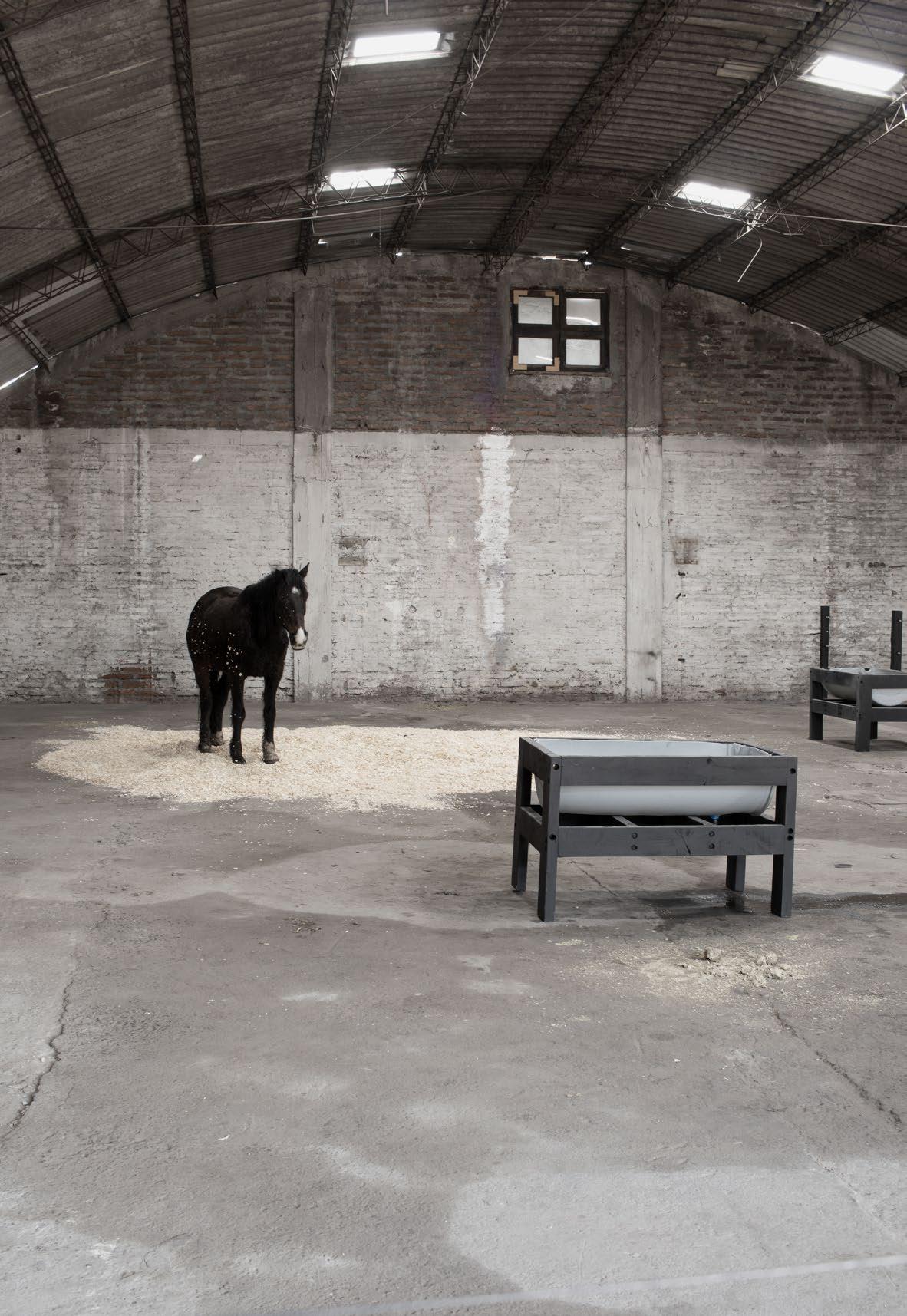 En esta ocasión se trató de realizar, en un galpón de viejo cuño industrial, dos corrales de igual tamaño. Uno de ellos lo ocupó un árbol de Encino y el otro un caballo.
