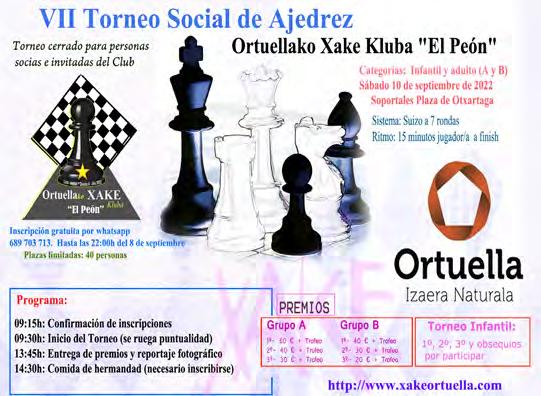 El día 10/09/2022 fue otro de esos días “especiales” y que quedará también marcado en la historia de este club. Se celebró la VII Edición de nuestro Tor neo social. Finalmente y después de algunas bajas de última hora fuimos 46 los jugador@s (43 peones y tres invitados, uno en cada categoría). Mencionar que el torneo es un torneo cerrado a l@s soci@s y jugador@s del club y de nuestra Eskola, aunque to dos los años a nivel particular también incluimos algún invitado. En esta ocasión y tal y como men cionábamos anteriormente uno en cada categoría; en el grupo A fue un ya casi miembro del club, Juan Carlos García Zurdo; en el grupo B, Iker Mayo, y en el grupo C , Aitor Juárez.