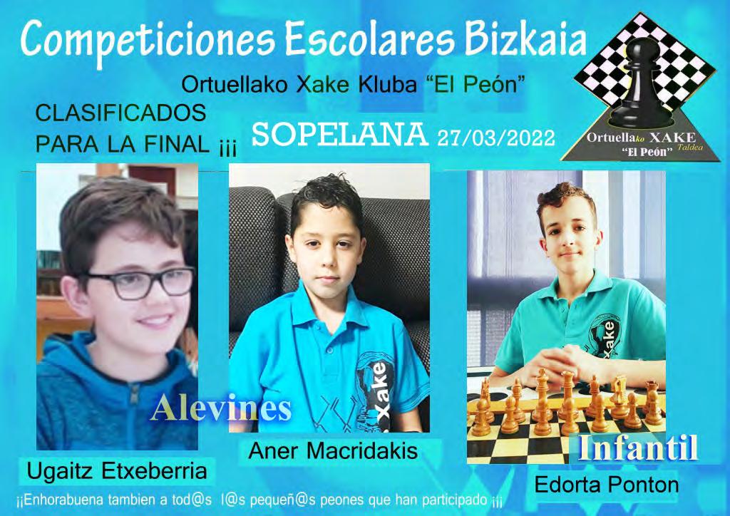 también vinieron las competiciones escolares organiza das por la Diputación Foral de Bizkaia (DFB) y la Federación Vizcaína de aje drez ( FVDA) , dentro del entorno del Deporte Escolar vizcaíno , en las cua les nuestr@s pequeñ@s peones com pitieron con los colores de Ortuella.