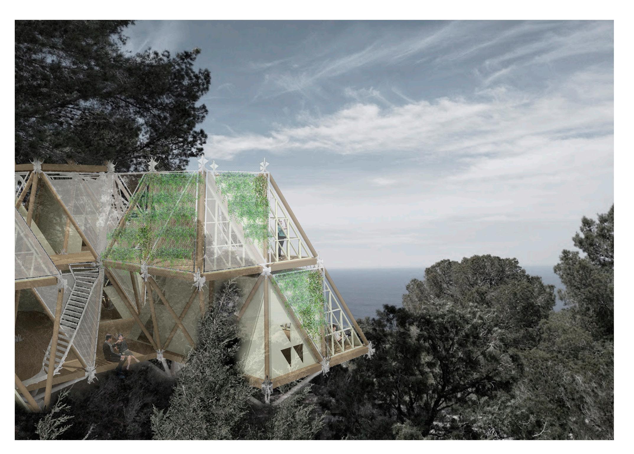 Ibiza is the center of attention during the summer months. This huge theater the size of an island begins to dismantle when summer ends and work life along with less pleasant weather begins. The island varies radically in terms of its number of inhabitants during the year, however, there is no parallel with the architectural framework where all these tourist activities take place. The proposal consists of the design of a small hotel with a light and resistant triangulated structure that allows rapid assembly and disassembly capable of appearing and disappearing, growing and decreasing, when the tourist flow demands it. The bars that are arranged in the structure have a local pine wood shaft with a fixed steel tip that allows connection at the joints with a system of screws. At the same time, a minimum footprint is sought in the nature of Ibiza so it will support the smallest possible points on the ground.