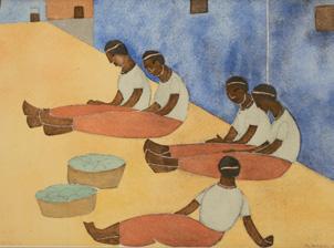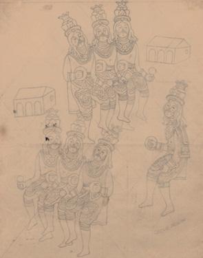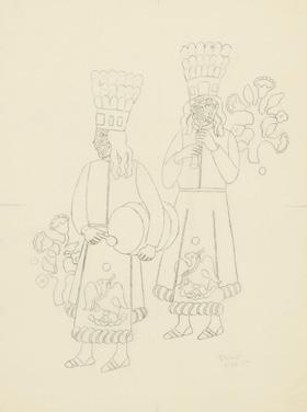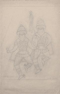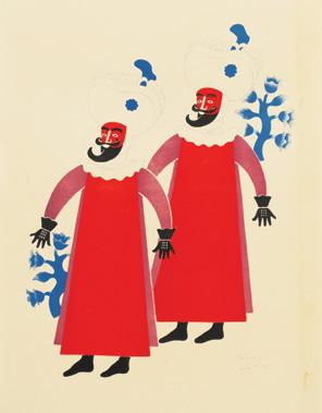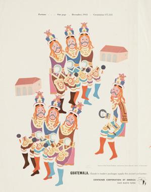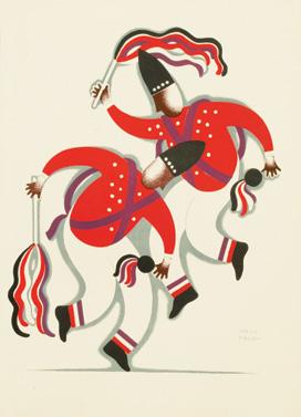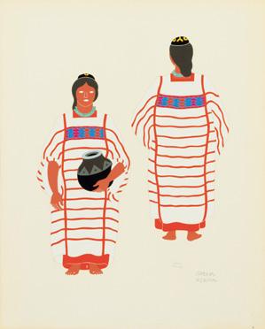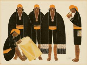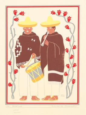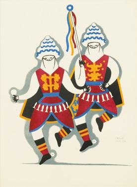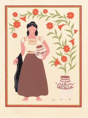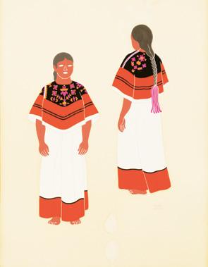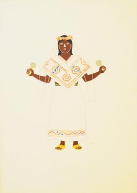 In 1914 Carlos Mérida travelled back to his homeland, it was then when he experienced a ‘rediscovery’ of his own continent. About this occurrence he wrote: “Tuve la sensación de que había descubierto América, un mundo nuevo poblado de tales visiones que eclipsaban por completo la suma de impresiones recibidas en Europa.” With different eyes he observed the radiant traditions, rituals and landscapes of Guatemala. He studied the folklore of his indigenous heritage and incorporated these motifs in his series of Guatemalan and Mexican Costumes and Dances of Mexico.