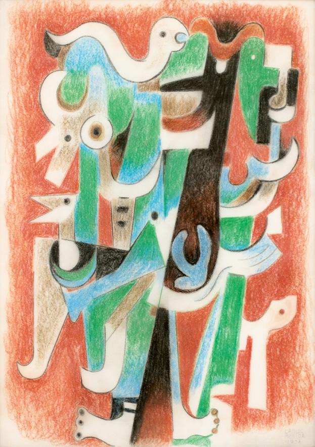 Carlos Mérida was driven by an everlasting curiosity. Throughout his life, the artist travelled, worked and exhibited all over the world. His experiences in Europe and America play crucial parts in his oeuvre. An important stage in Mérida’s formation as an artist was during the 1910s when he first went to Paris. Travelling to the booming capital of the art world meant a lot to the young artist. Mérida admired the works of European avant-gardists and studied the innovative, unsettling portraits by Amedeo Modigliani and the abstract works of artists as Pablo Picasso, Paul Klee, Joan Miró and Wassily Kandinsky. The encounters with the paintings and be-friending these artists left a deep impression on the artist and visibly influenced his work.